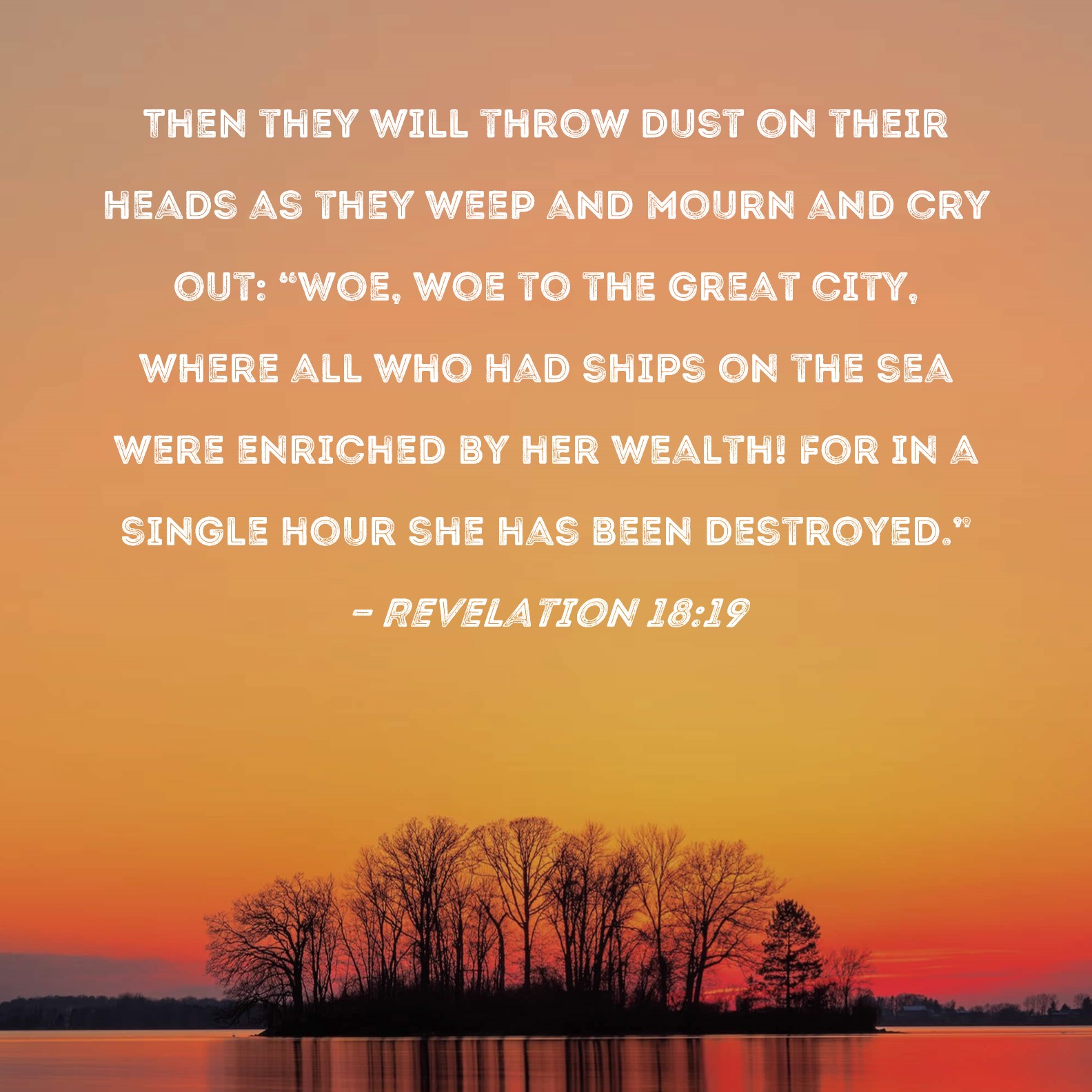 Revelation 18:19 Then they will throw dust on their heads as they weep and mourn and cry out: "Woe, woe to the great city, where all who had ships on the sea were enriched by her wealth! For in a single hour she has been destroyed."