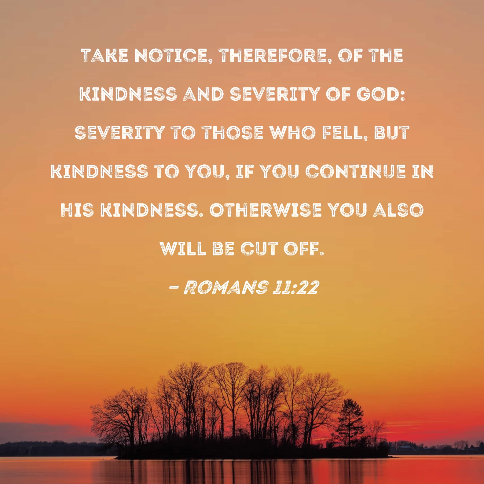 Romans 11:22 Take notice, therefore, of the kindness and severity of God: severity to those who fell, but kindness to you, if you continue in His kindness. Otherwise you also will be cut off.