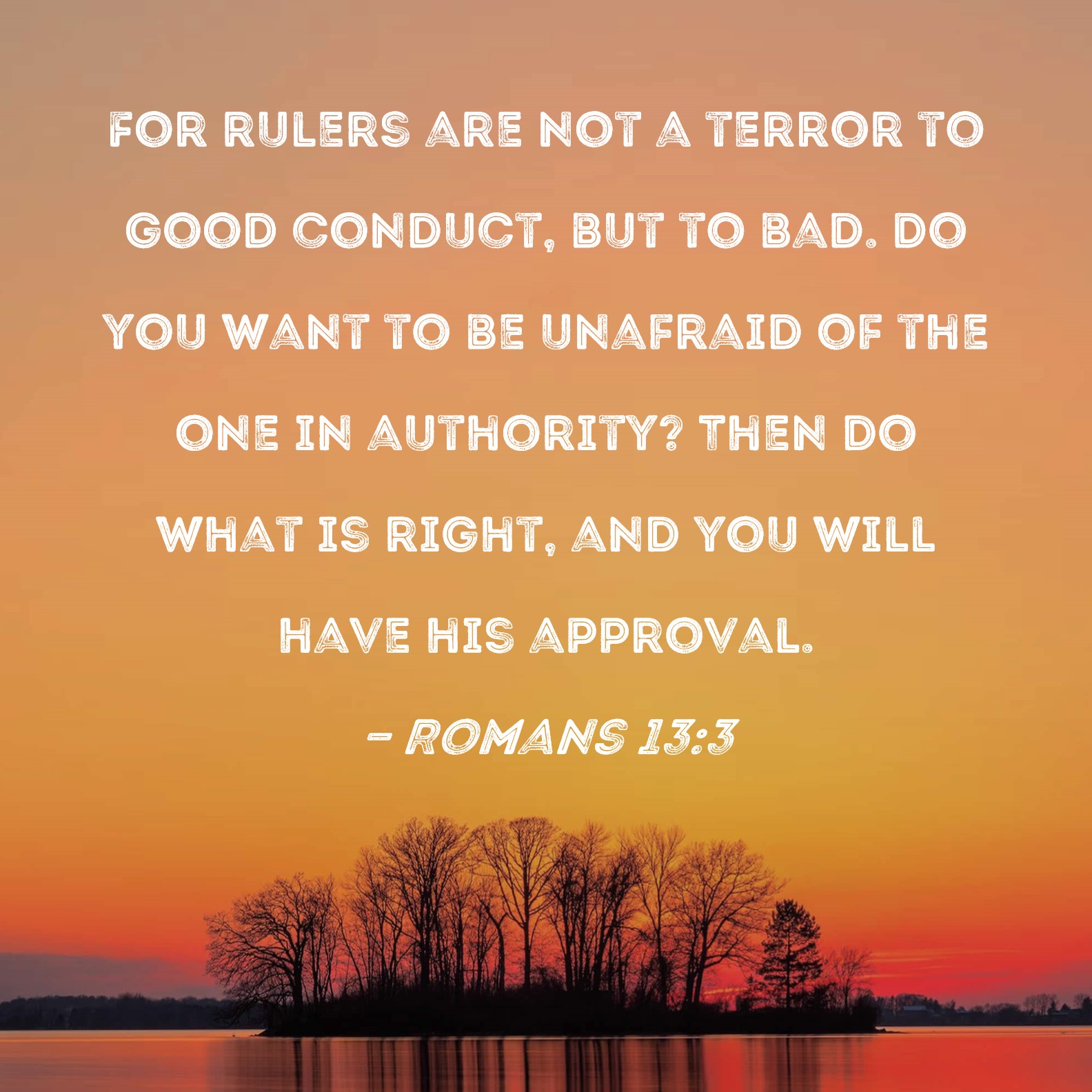 Romans 13:3 For rulers are not a terror to good conduct, but to bad. Do you want to be unafraid of the one in authority? Then do what is right, and you will have his approval.