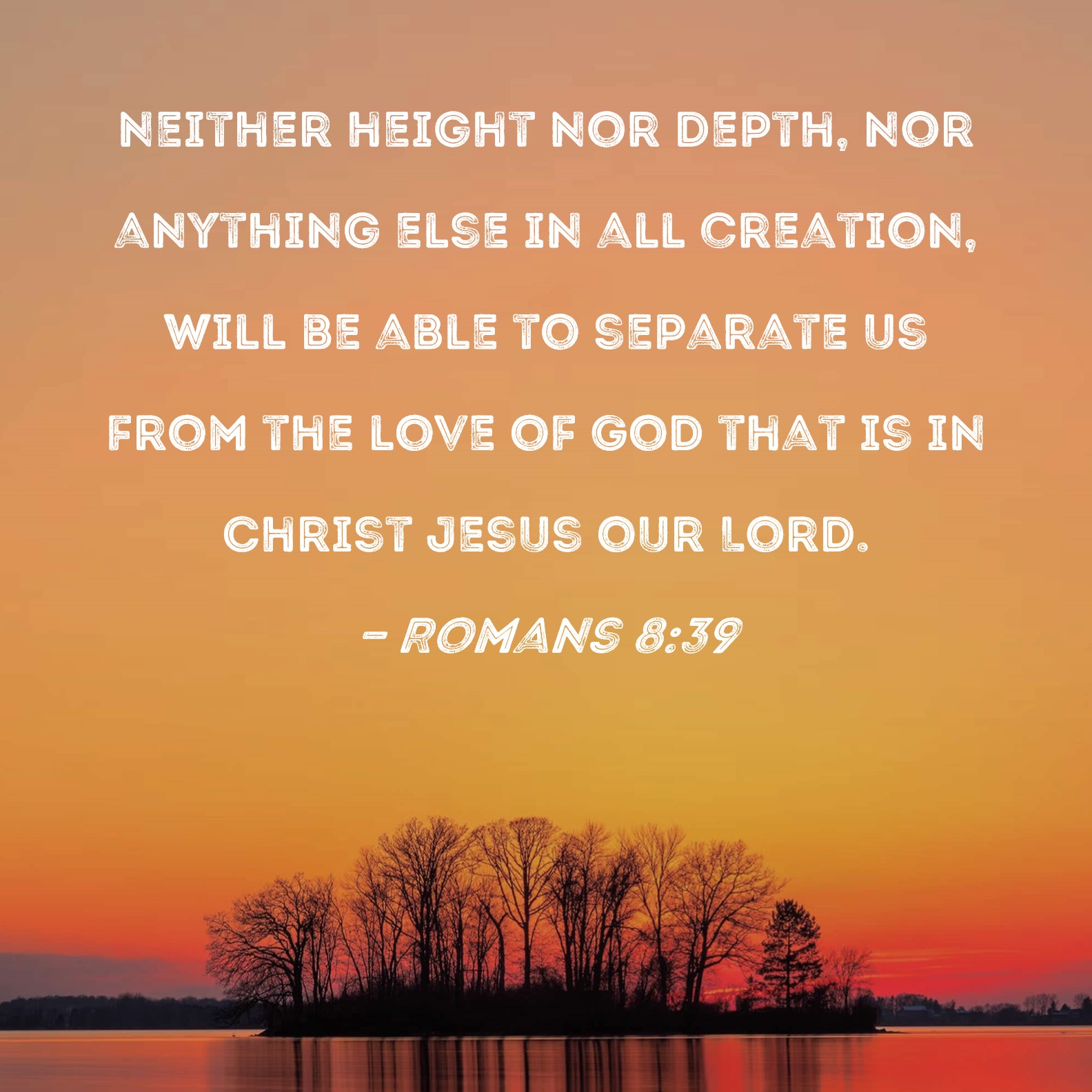 Romans 8:39 neither height nor depth, nor anything else in all creation, will be able to separate us from the love of God that is in Christ Jesus our Lord.