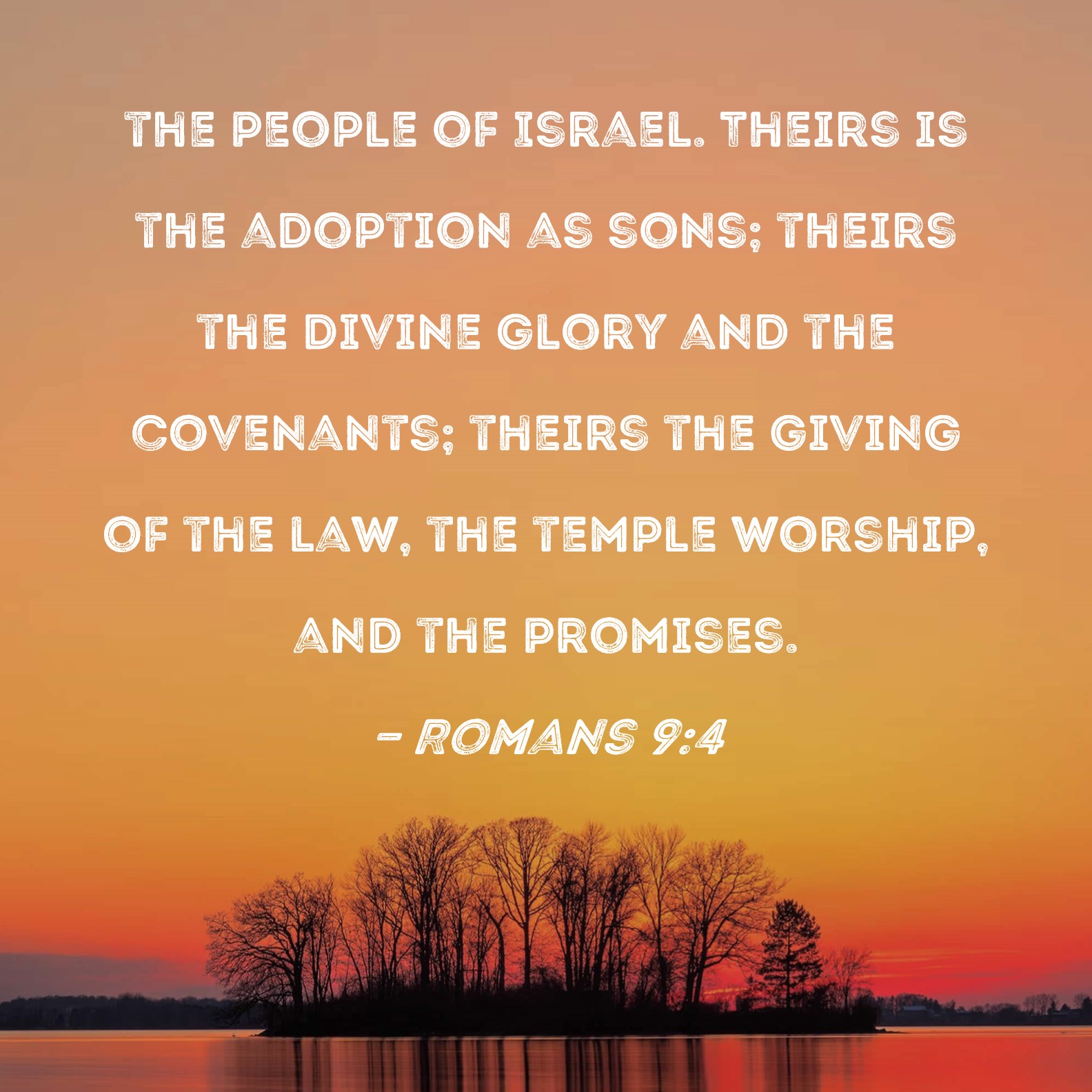 Romans 9:4 the people of Israel. Theirs is the adoption as sons; theirs the divine glory and the covenants; theirs the giving of the law, the temple worship, and the promises.