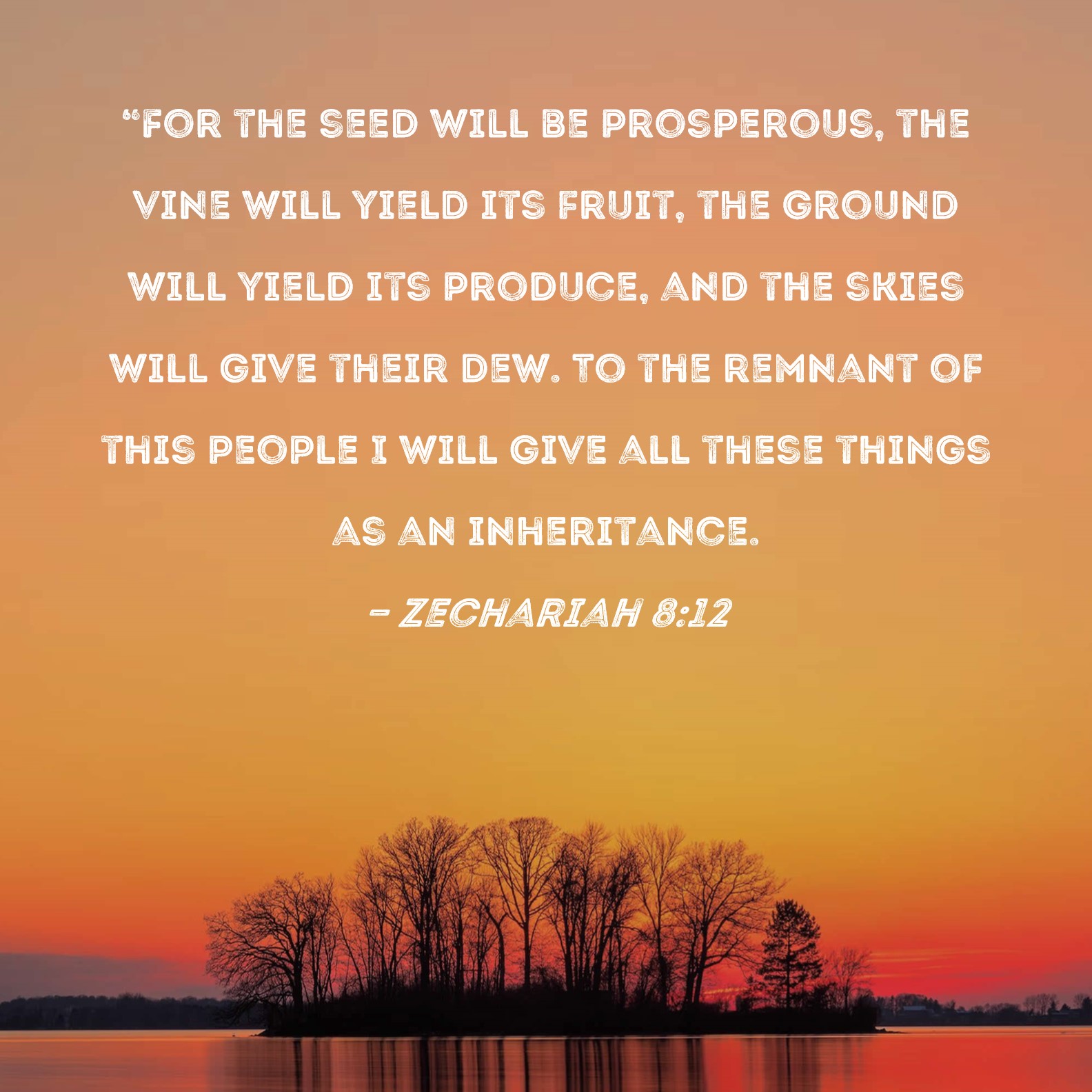 Zechariah 8:12 "For the seed will be prosperous, the vine will yield its fruit, the ground will yield its produce, and the skies will give their dew. To the remnant of this people I will give all these things as an inheritance.