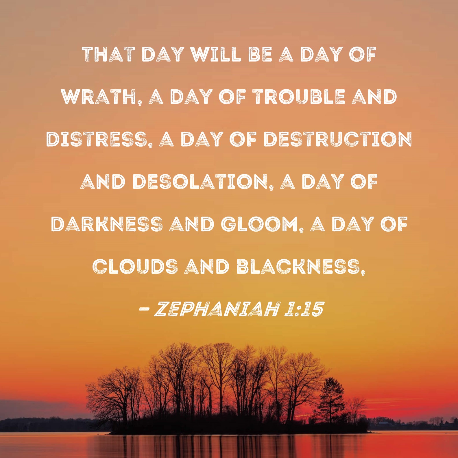 Zephaniah 1:15 That day will be a day of wrath, a day of trouble and distress, a day of destruction and desolation, a day of darkness and gloom, a day of clouds and blackness,