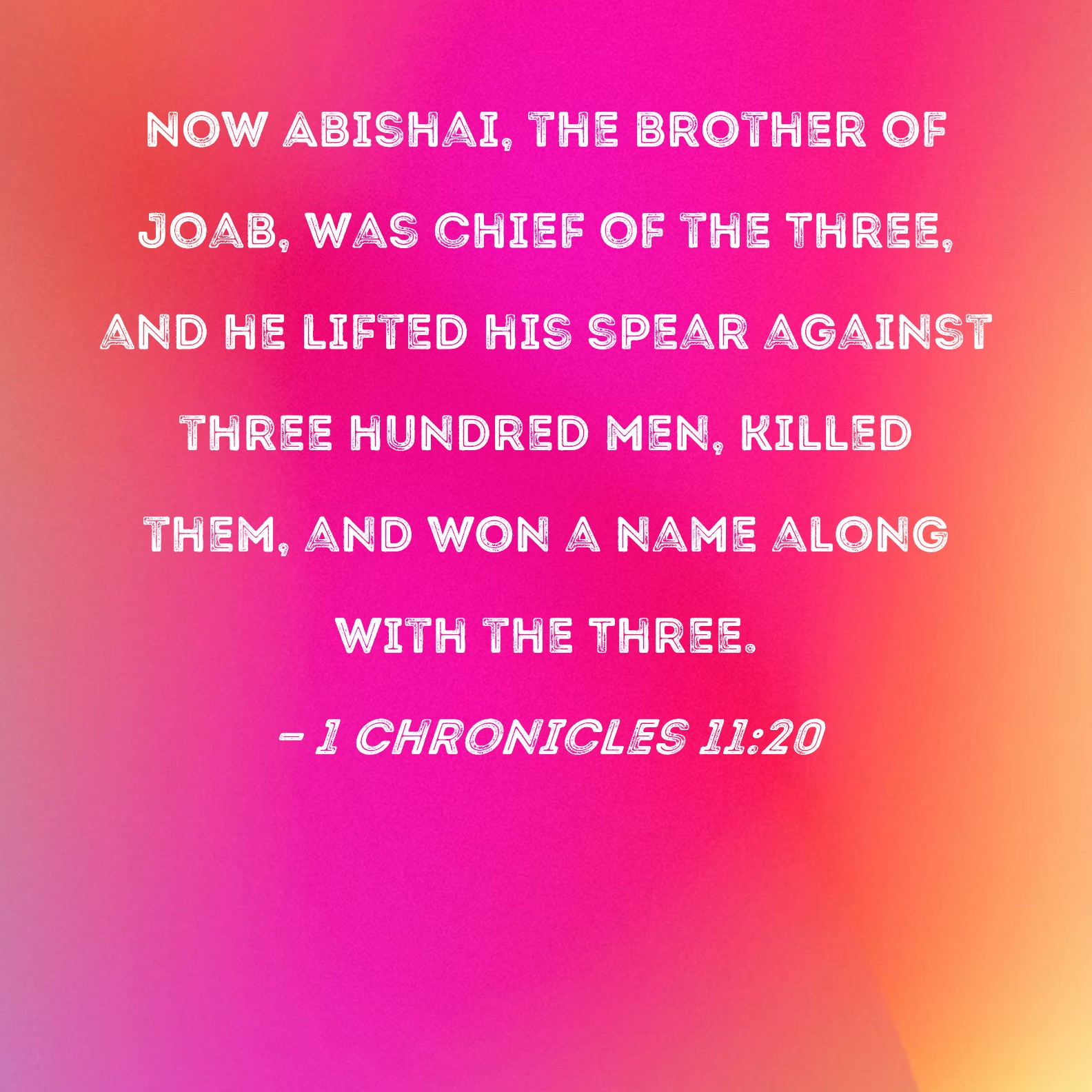 1 Chronicles 11:20 Now Abishai, the brother of Joab, was chief of the Three, and he lifted his spear against three hundred men, killed them, and won a name along with the Three.