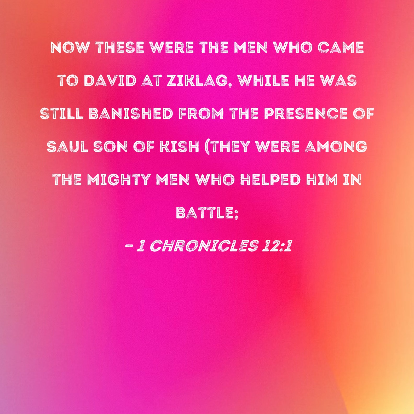 1 Chronicles 12:1 Now these were the men who came to David at Ziklag, while he was still banished from the presence of Saul son of Kish (they were among the mighty men who helped him in battle;