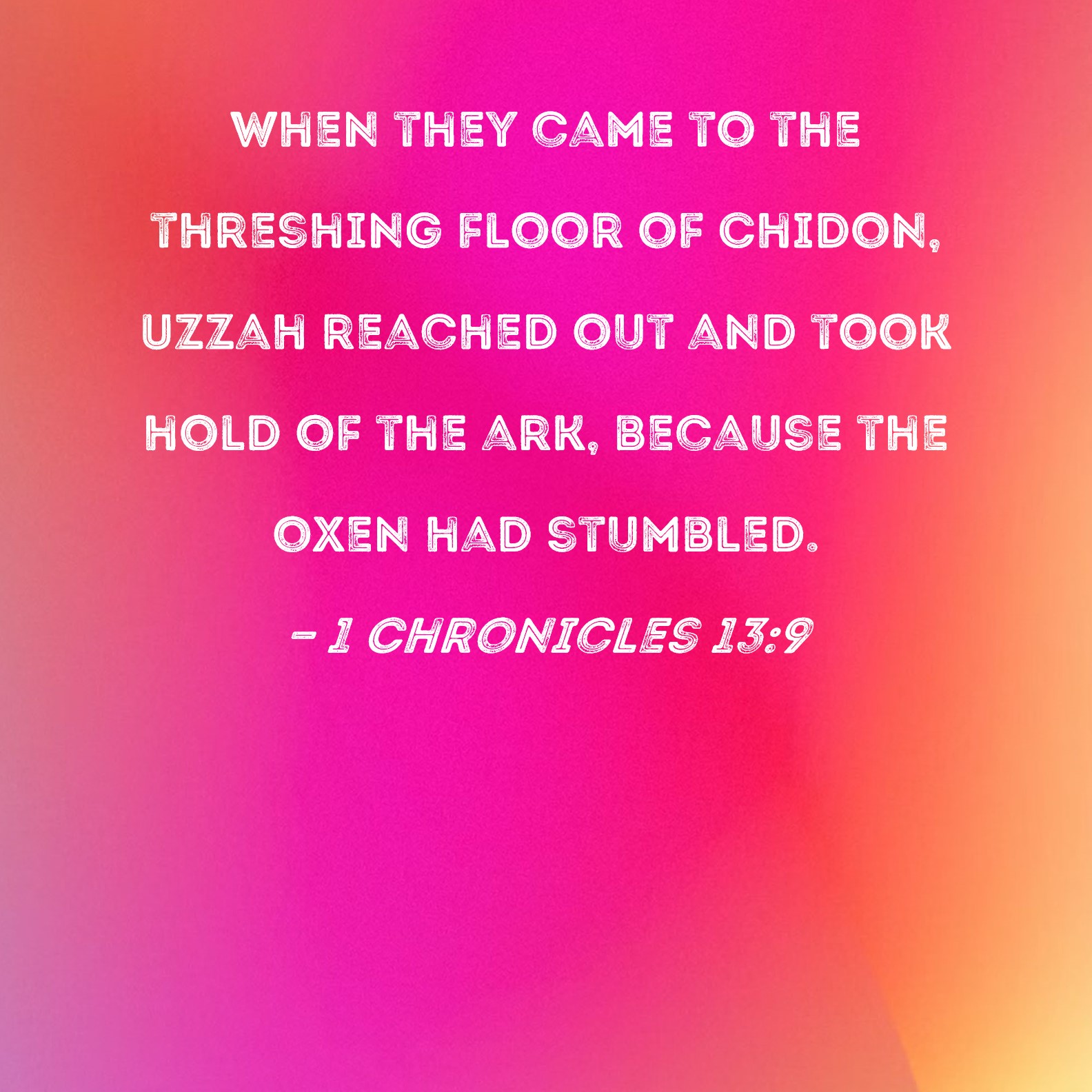 1 Chronicles 13:9 When they came to the threshing floor of Chidon, Uzzah reached out and took hold of the ark, because the oxen had stumbled.