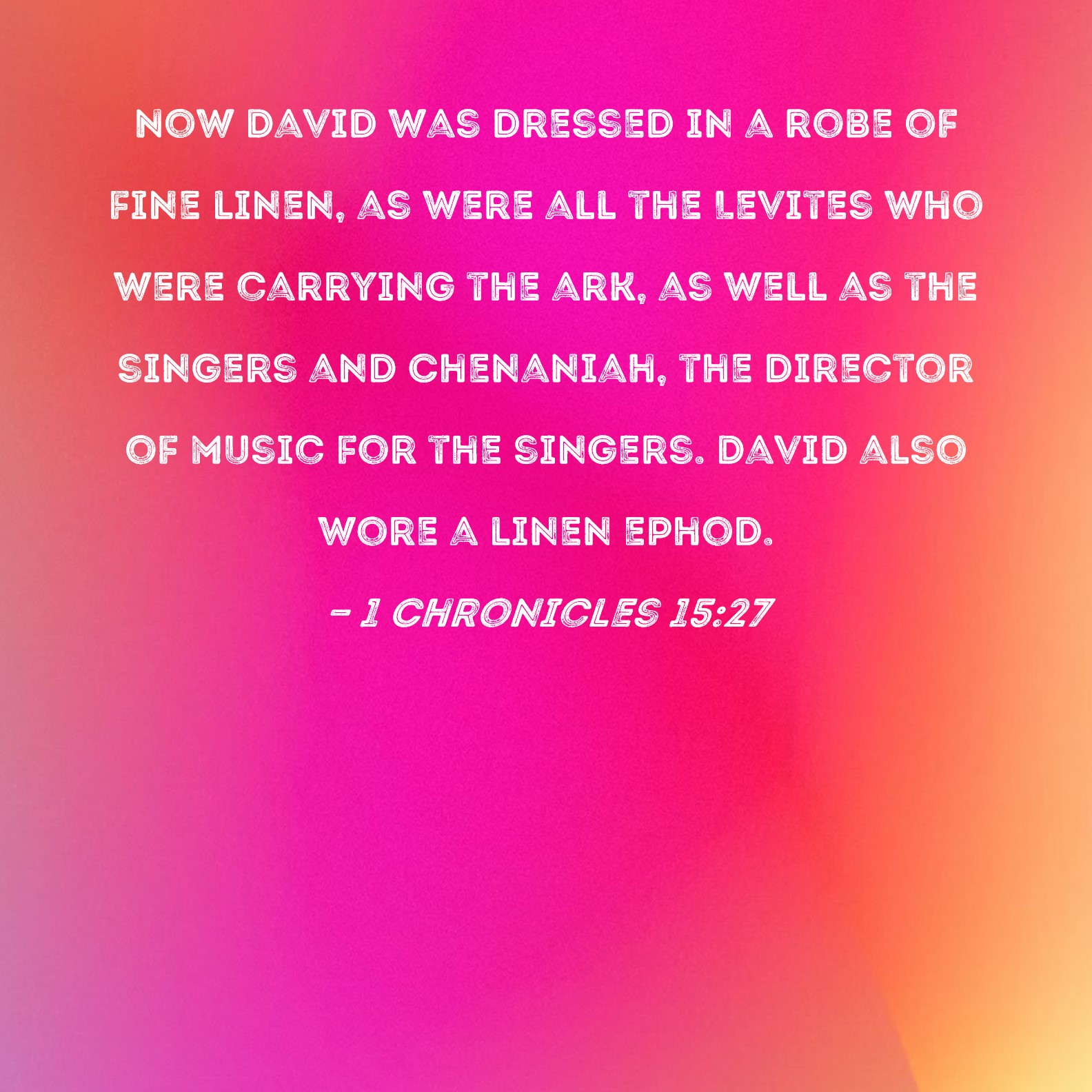 1 Chronicles 15:27 Now David was dressed in a robe of fine linen, as were all the Levites who were carrying the ark, as well as the singers and Chenaniah, the director of music for the singers. David also wore a linen ephod.