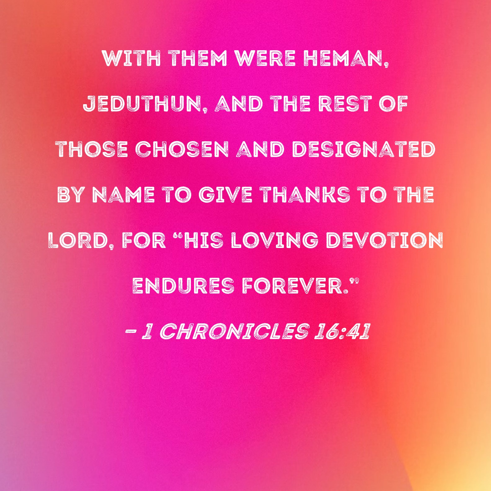1 Chronicles 16:41 With them were Heman, Jeduthun, and the rest of those chosen and designated by name to give thanks to the LORD, for "His loving devotion endures forever."