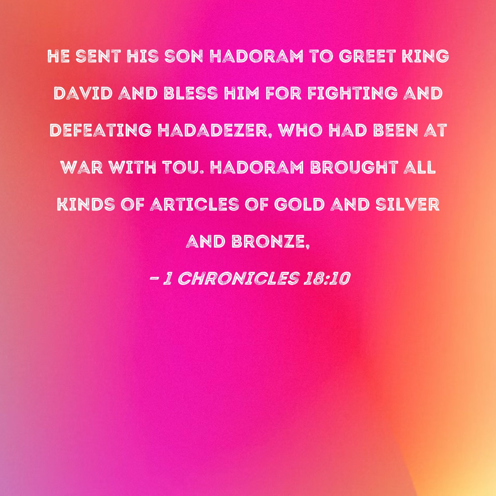 1 Chronicles 18:10 he sent his son Hadoram to greet King David and bless him for fighting and defeating Hadadezer, who had been at war with Tou. Hadoram brought all kinds of articles of gold and silver and bronze,