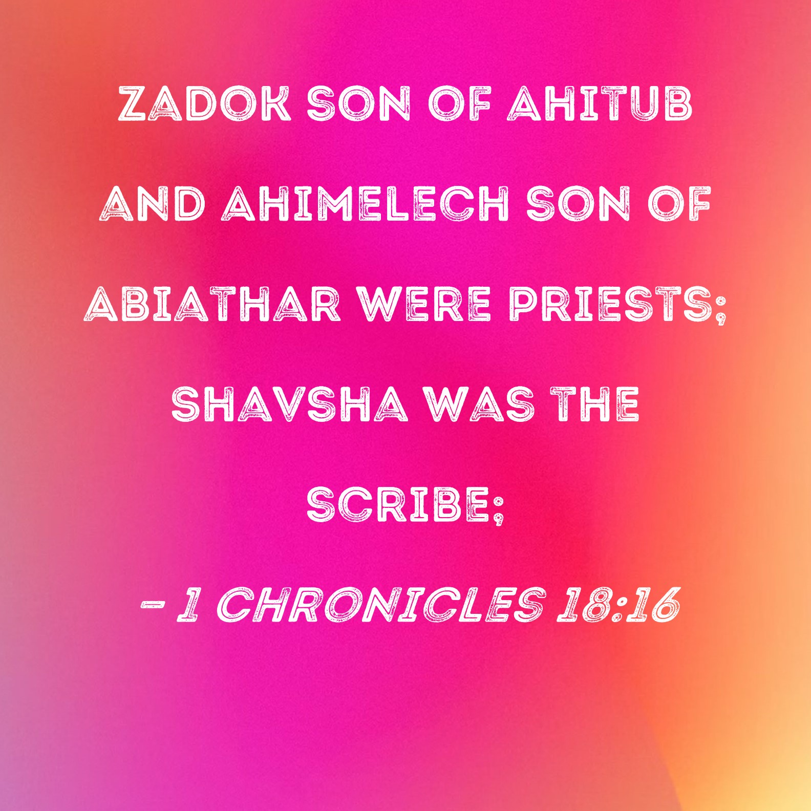 1 Chronicles 18:16 Zadok son of Ahitub and Ahimelech son of Abiathar were priests; Shavsha was the scribe;