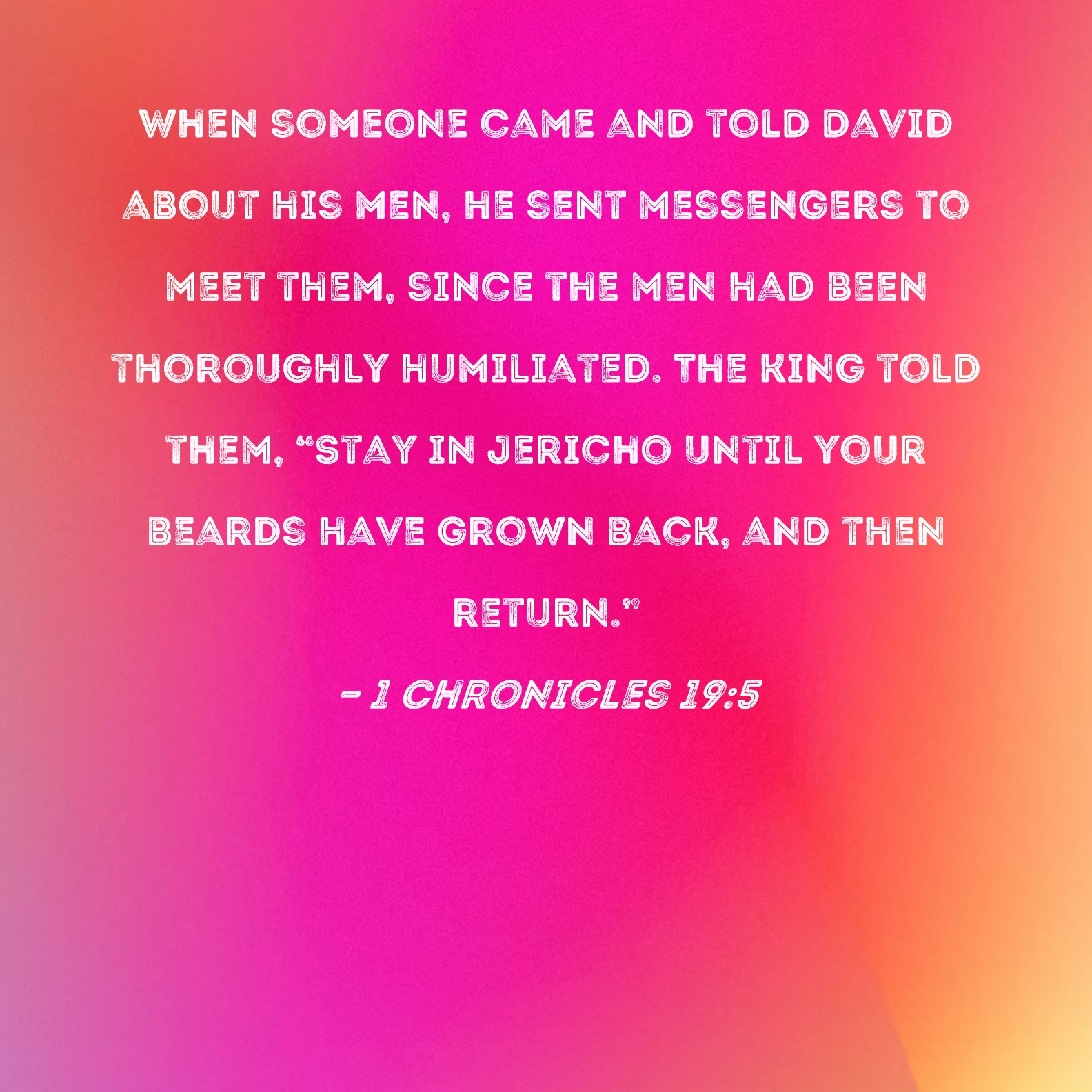 1 Chronicles 19:5 When someone came and told David about his men, he sent messengers to meet them, since the men had been thoroughly humiliated. The king told them, "Stay in Jericho until your beards have grown back, and then return."