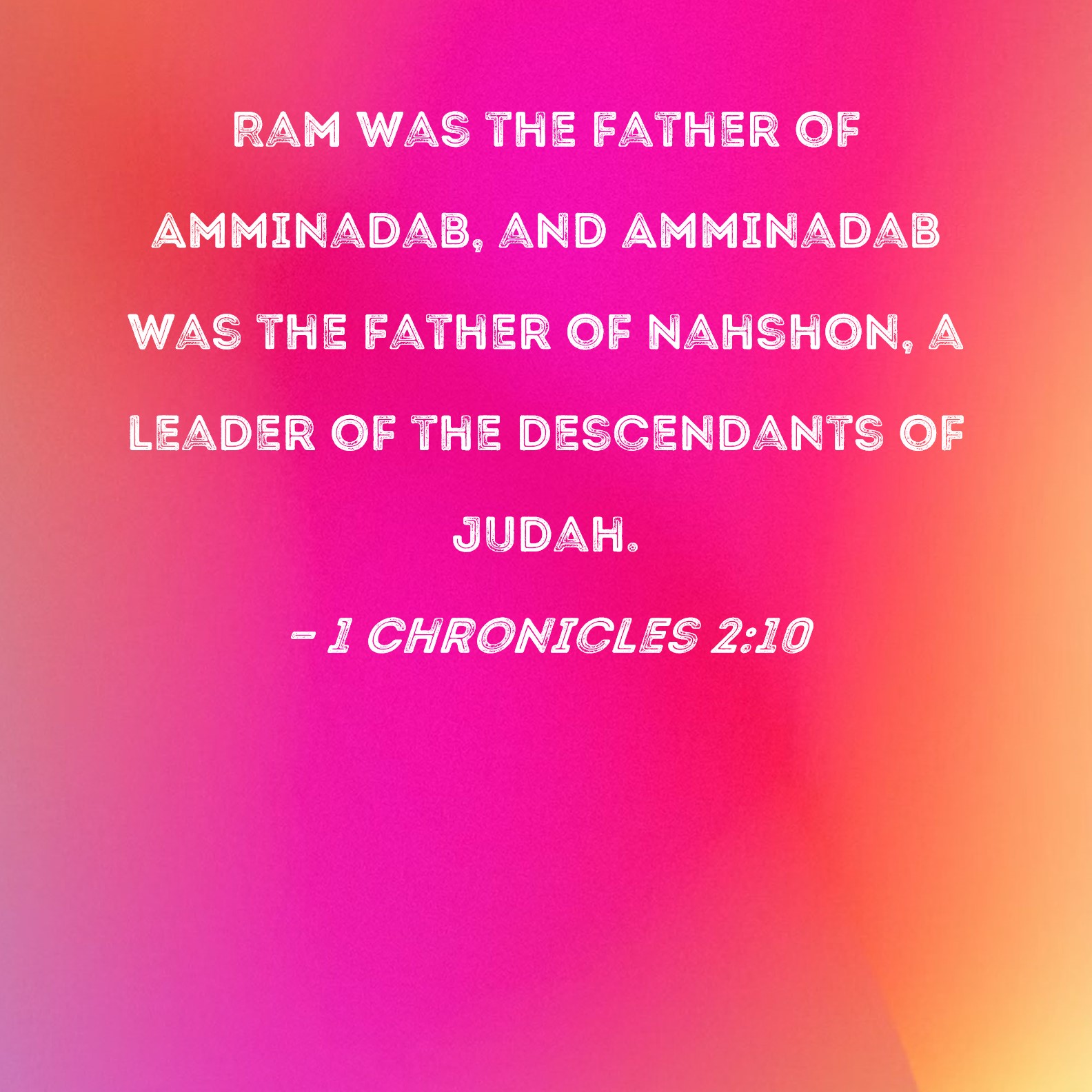 BSB: Ram was the father of Amminadab, and Amminadab was the father of Nahshon, a leader of the descendants of Judah. KJV: And Ram begat Amminadab; and Amminadab begat Nahshon, prince of the children of Judah; DRB: And Ram beget Aminadab, and Aminadab beget Nahasson, prince of the children of Juda. DBT: And Ram begot Amminadab; and Amminadab begot Nahshon, prince of the children of Judah; ERV: And Ram begat Amminadab; and Amminadab begat Nahshon, prince of the children of Judah; WBT: And Ram begat Amminadab; and Amminadab begat Nahshon, prince of the children of Judah; WEB: Ram became the father of Amminadab, and Amminadab became the father of Nahshon, prince of the children of Judah; YLT: And Ram begat Amminadab, and Amminadab begat Nahshon, prince of the sons of Judah;Links 1 Chronicles 2:10 NIV • 1 Chronicles 2:10 NLT • 1 Chronicles 2:10 ESV • 1 Chronicles 2:10 NASB • 1 Chronicles 2:10 KJV • 1 Chronicles 2:10 Interlinear • 1 Chronicles 2:10 Commentaries • 1 Chronicles 2:10 Parallel Texts • 1 Chronicles 2:10 Bible Apps • 1 Chronicles 2:10 Parallel • Bible Hub |