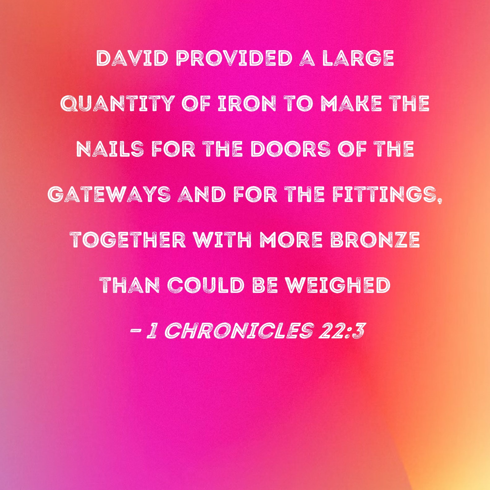 BSB: David provided a large quantity of iron to make the nails for the doors of the gateways and for the fittings, together with more bronze than could be weighed KJV: And David prepared iron in abundance for the nails for the doors of the gates, and for the joinings; and brass in abundance without weight; DRB: And David prepared in abundance iron for the nails of the gates, and for the closures and joinings: and of brass an immense weight. DBT: And David prepared iron in abundance for the nails for the doors of the gates, and for the joists, and brass in abundance without weight; ERV: And David prepared iron in abundance for the nails for the doors of the gates, and for the couplings; and brass in abundance without weight; WBT: And David prepared iron in abundance for the nails for the doors of the gates, and for the joinings; and brass in abundance without weight; WEB: David prepared iron in abundance for the nails for the doors of the gates and for the couplings, and bronze in abundance without weight, YLT: And iron in abundance for nails for leaves of the gates, and for couplings, hath David prepared, and brass in abundance — there is no weighing.Links 1 Chronicles 22:3 NIV • 1 Chronicles 22:3 NLT • 1 Chronicles 22:3 ESV • 1 Chronicles 22:3 NASB • 1 Chronicles 22:3 KJV • 1 Chronicles 22:3 Interlinear • 1 Chronicles 22:3 Commentaries • 1 Chronicles 22:3 Parallel Texts • 1 Chronicles 22:3 Bible Apps • 1 Chronicles 22:3 Parallel • Bible Hub |
