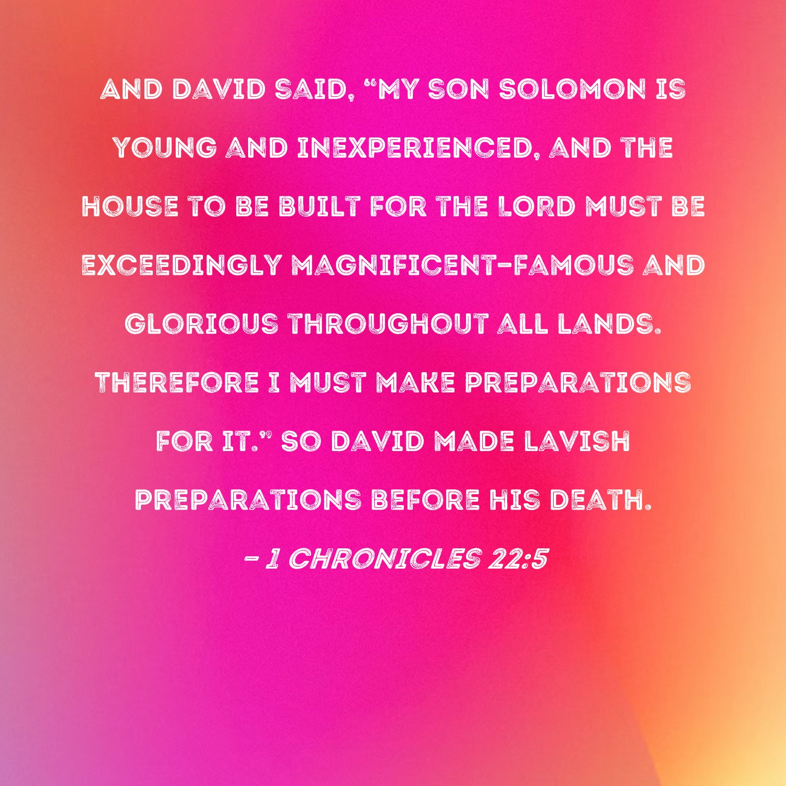 1 Chronicles 22:5 And David said, "My son Solomon is young and inexperienced, and the house to be built for the LORD must be exceedingly magnificent--famous and glorious throughout all lands. Therefore I must make preparations for it." So David made lavish preparations before his death.