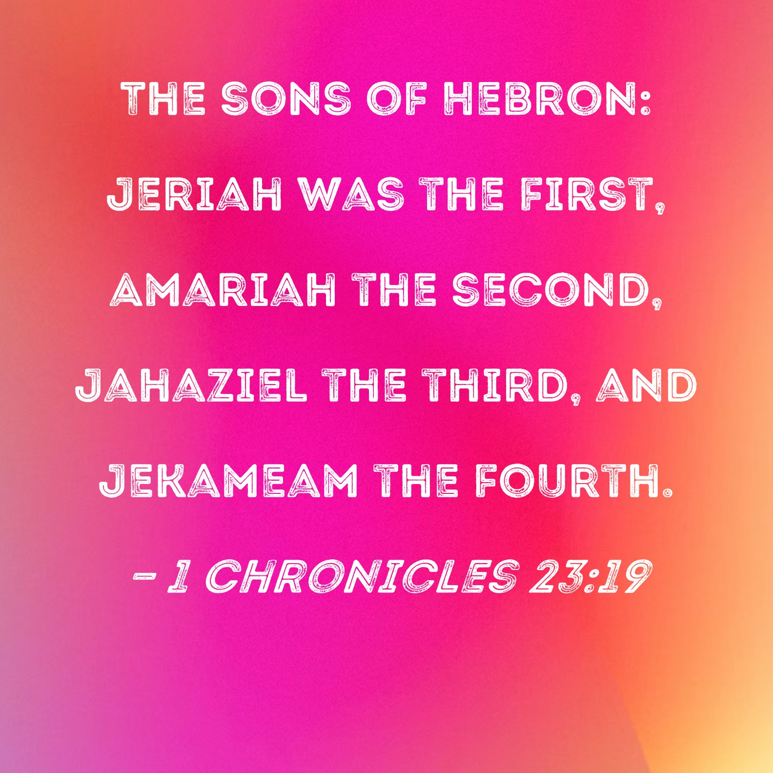 BSB: The sons of Hebron: Jeriah was the first, Amariah the second, Jahaziel the third, and Jekameam the fourth. KJV: Of the sons of Hebron; Jeriah the first, Amariah the second, Jahaziel the third, and Jekameam the fourth. DRB: The sons of Hebron: Jeriau the first, Amarias the second, Jahaziel the third, Jecmaam the fourth. DBT: The sons of Hebron: Jeriah the head, Amariah the second, Jahaziel the third, and Jekameam the fourth. ERV: The sons of Hebron; Jeriah the chief, Amariah the second, Jahaziel the third, and Jekameam the fourth. WBT: Of the sons of Hebron; Jeriah the first, Amariah the second, Jehaziel the third, and Jekameam the fourth. WEB: The sons of Hebron: Jeriah the chief, Amariah the second, Jahaziel the third, and Jekameam the fourth. YLT: Sons of Hebron: Jeriah the head, Amariah the second, Jahaziel the third, and Jekameam the fourth.Links 1 Chronicles 23:19 NIV • 1 Chronicles 23:19 NLT • 1 Chronicles 23:19 ESV • 1 Chronicles 23:19 NASB • 1 Chronicles 23:19 KJV • 1 Chronicles 23:19 Interlinear • 1 Chronicles 23:19 Commentaries • 1 Chronicles 23:19 Parallel Texts • 1 Chronicles 23:19 Bible Apps • 1 Chronicles 23:19 Parallel • Bible Hub |