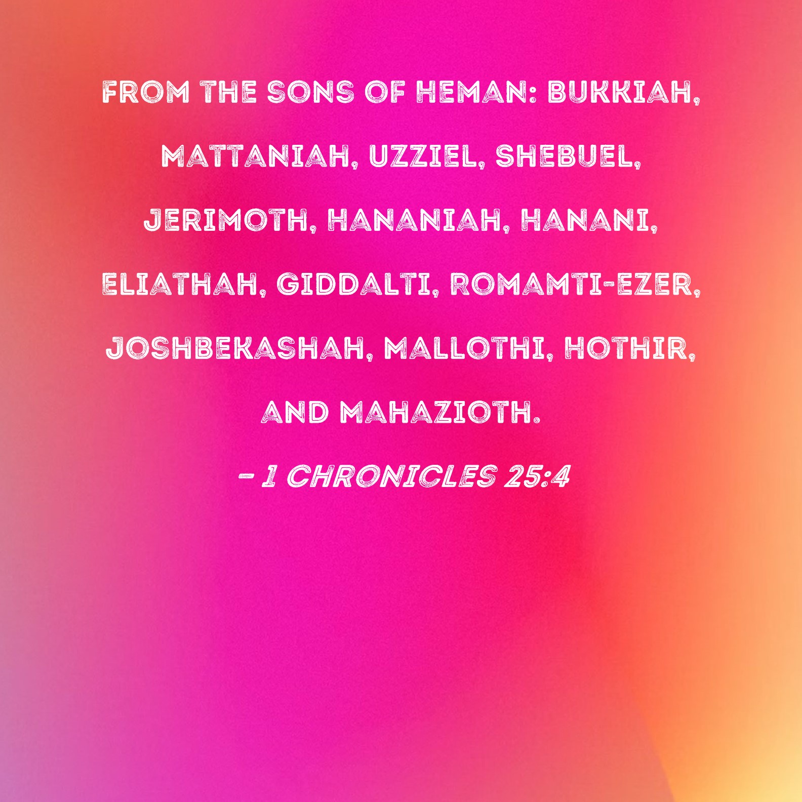 KJV:  Of Heman: the sons of Heman; Bukkiah, Mattaniah, Uzziel, Shebuel, and Jerimoth, Hananiah, Hanani, Eliathah, Giddalti, and Romamtiezer, Joshbekashah, Mallothi, Hothir, and Mahazioth: