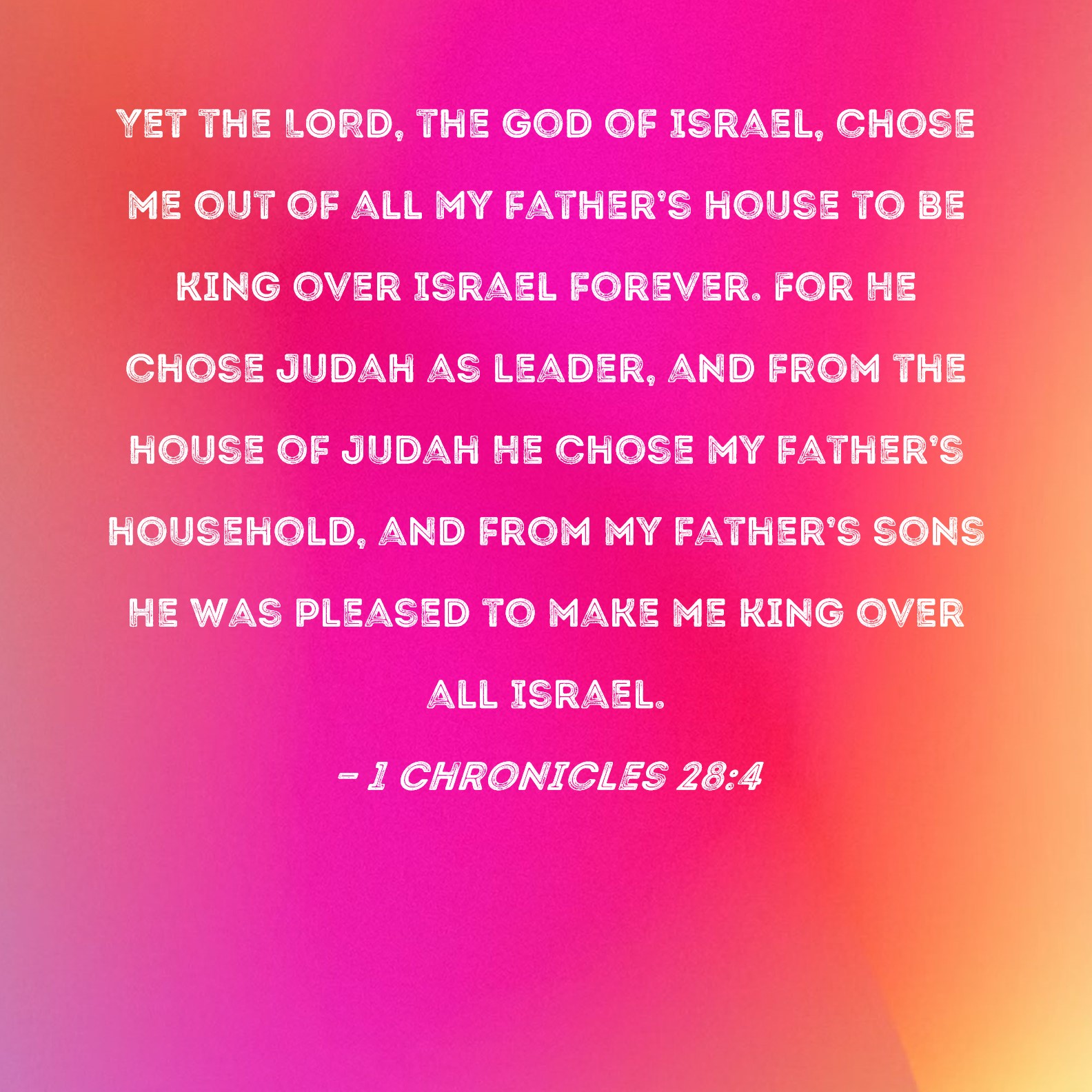 1 Chronicles 28:4 Yet the LORD, the God of Israel, chose me out of all my father's house to be king over Israel forever. For He chose Judah as leader, and from the house of Judah He chose my father's household, and from my father's sons He was pleased to make me king over all Israel.
