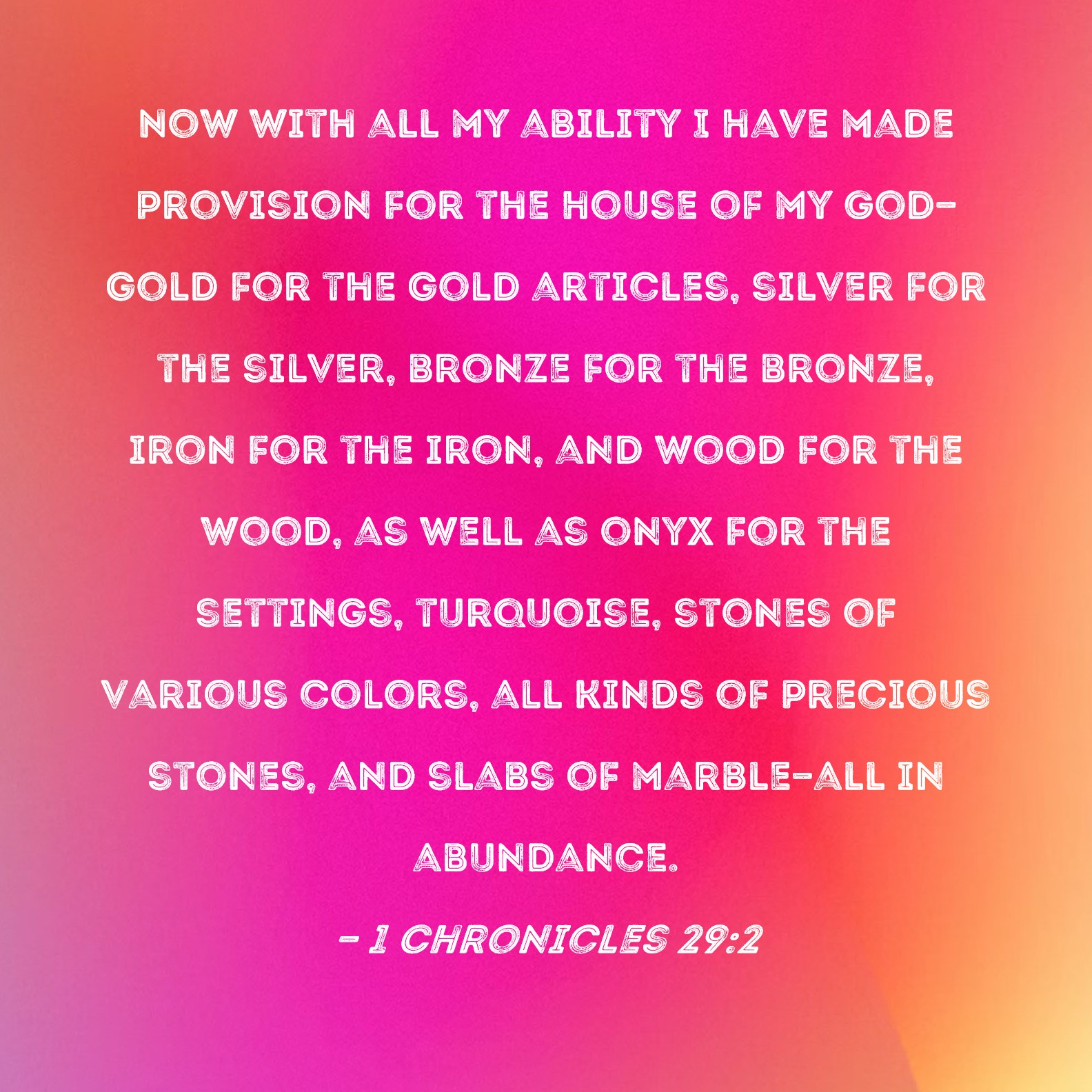1 Chronicles 29:2 Now with all my ability I have made provision for the house of my God--gold for the gold articles, silver for the silver, bronze for the bronze, iron for the iron, and wood for the wood, as well as onyx for the settings, turquoise, stones of various colors, all kinds of precious stones, and slabs of marble--all in abundance.