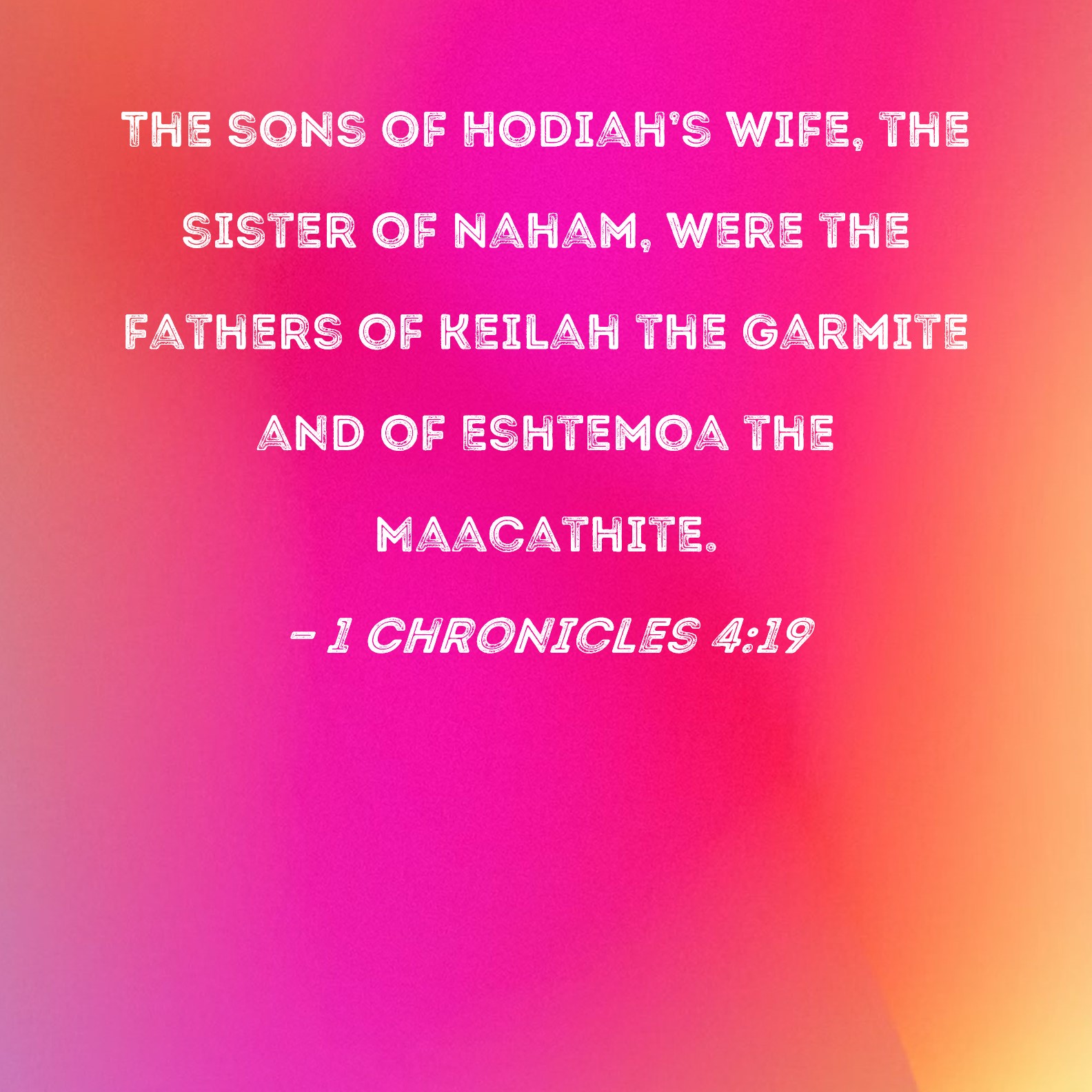 1 Chronicles 4:19 The sons of Hodiah's wife, the sister of Naham, were the fathers of Keilah the Garmite and of Eshtemoa the Maacathite.