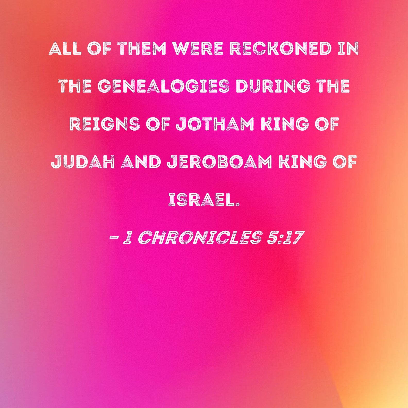 1 Chronicles 5:17 All of them were reckoned in the genealogies during the reigns of Jotham king of Judah and Jeroboam king of Israel.