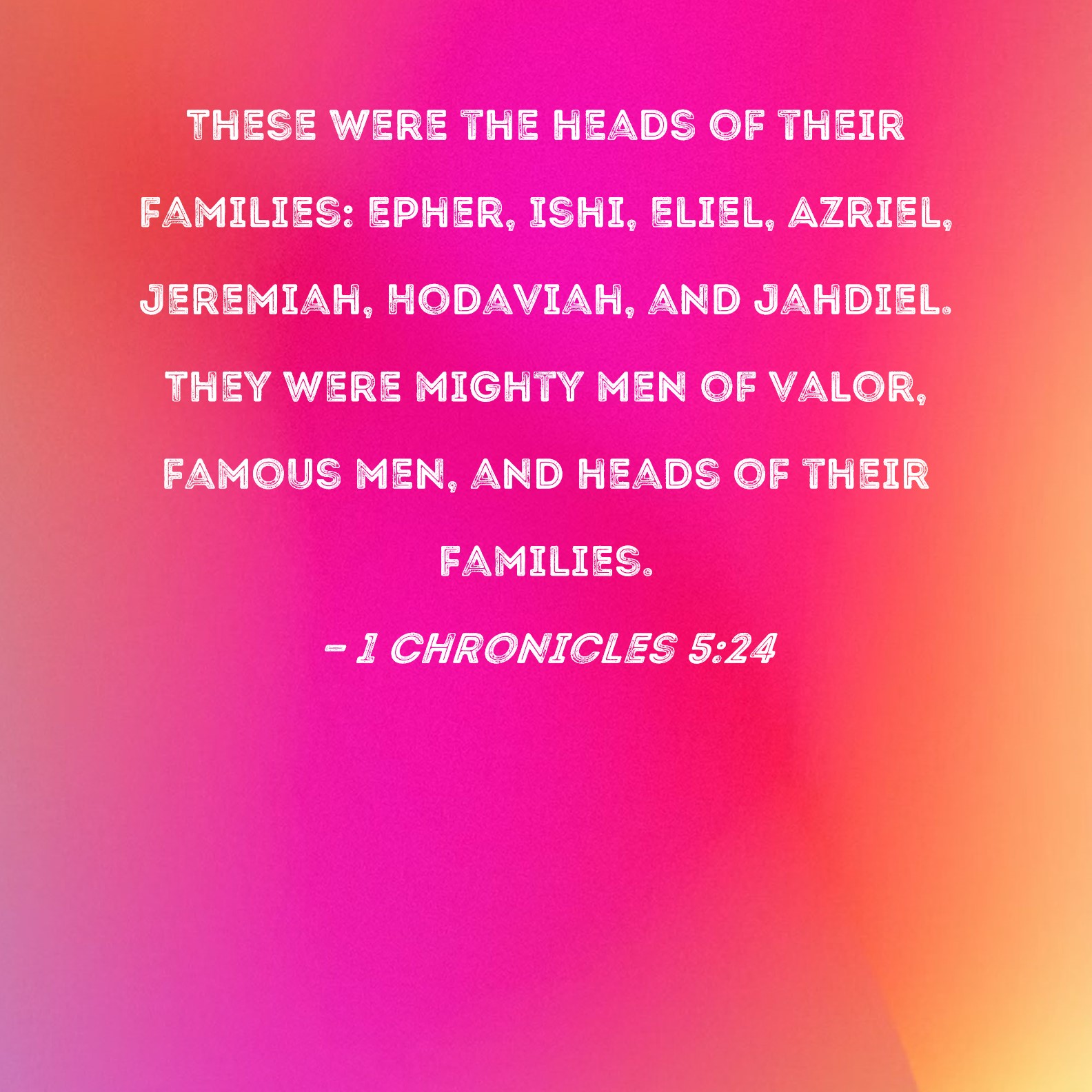 1 Chronicles 5:24 These were the heads of their families: Epher, Ishi, Eliel, Azriel, Jeremiah, Hodaviah, and Jahdiel. They were mighty men of valor, famous men, and heads of their families.
