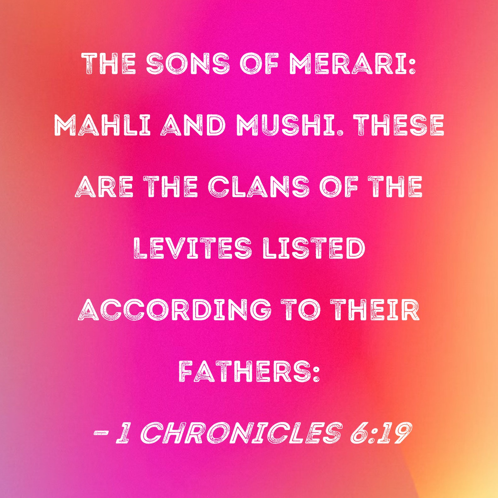 1 Chronicles 6:19 The sons of Merari: Mahli and Mushi. These are the clans of the Levites listed according to their fathers: