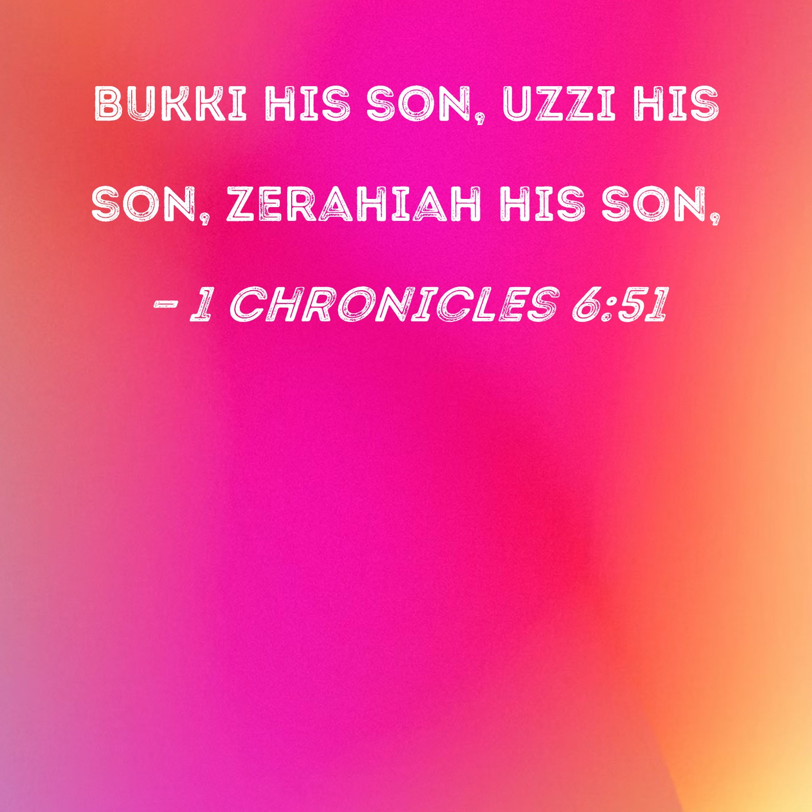 BSB: Bukki his son, Uzzi his son, Zerahiah his son, KJV: Bukki his son, Uzzi his son, Zerahiah his son, DRB: Bocci his son, Ozi his son, Zarahia his son, DBT: Bukki his son, Uzzi his son, Zerahiah his son, ERV: Bukki his son, Uzzi his son, Zerahiah his son; WBT: Bukki his son, Uzzi his son, Zerahiah his son, WEB: Bukki his son, Uzzi his son, Zerahiah his son, YLT: Bukki his son, Uzzi his son, Zerahiah his son,Links 1 Chronicles 6:51 NIV • 1 Chronicles 6:51 NLT • 1 Chronicles 6:51 ESV • 1 Chronicles 6:51 NASB • 1 Chronicles 6:51 KJV • 1 Chronicles 6:51 Interlinear • 1 Chronicles 6:51 Commentaries • 1 Chronicles 6:51 Parallel Texts • 1 Chronicles 6:51 Bible Apps • 1 Chronicles 6:51 Parallel • Bible Hub |