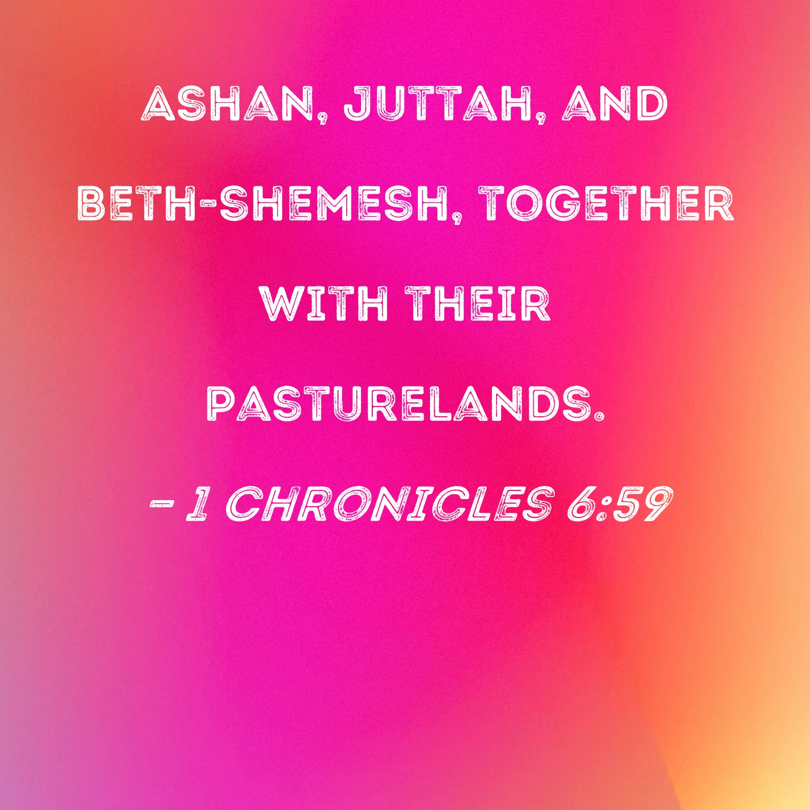 BSB: Ashan, Juttah, and Beth-shemesh, together with their pasturelands. KJV: And Ashan with her suburbs, and Bethshemesh with her suburbs: DRB: Asan also, and Bethsames, with their suburbs. DBT: and Ashan and its suburbs, and Beth-shemesh and its suburbs; ERV: and Ashan with her suburbs, and Beth-shemesh with her suburbs: WBT: And Ashan with its suburbs, and Beth-shemesh with its suburbs: WEB: Ashan with its pasture lands, and Beth Shemesh with its pasture lands; YLT: and Ashan and its suburbs, and Beth-Shemesh and its suburbs.Links 1 Chronicles 6:59 NIV • 1 Chronicles 6:59 NLT • 1 Chronicles 6:59 ESV • 1 Chronicles 6:59 NASB • 1 Chronicles 6:59 KJV • 1 Chronicles 6:59 Interlinear • 1 Chronicles 6:59 Commentaries • 1 Chronicles 6:59 Parallel Texts • 1 Chronicles 6:59 Bible Apps • 1 Chronicles 6:59 Parallel • Bible Hub |