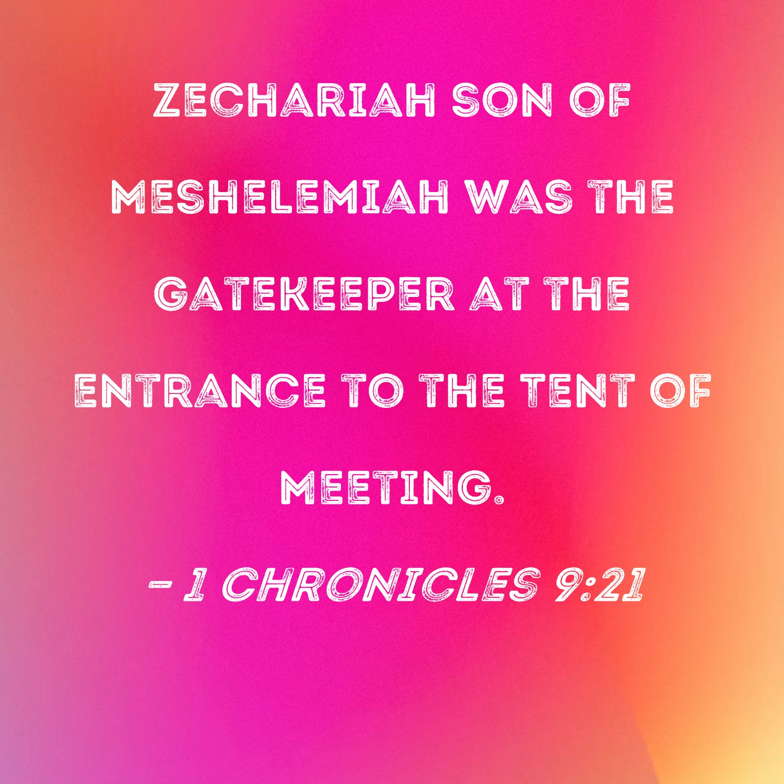 1 Chronicles 9:21 Zechariah son of Meshelemiah was the gatekeeper at the entrance to the Tent of Meeting.