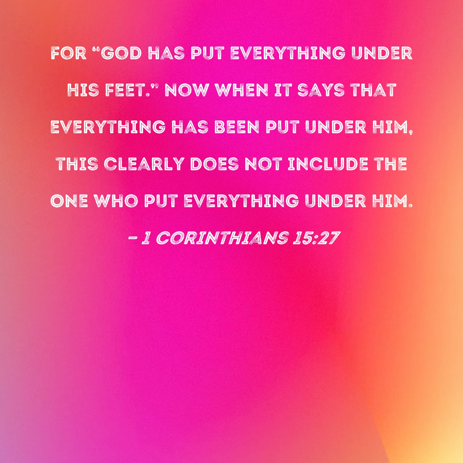BSB: For "God has put everything under His feet." Now when it says that everything has been put under Him, this clearly does not include the One who put everything under Him. KJV: For he hath put all things under his feet. But when he saith, all things are put under him, it is manifest that he is excepted, which did put all things under him. DRB: All things are put under him; undoubtedly, he is excepted, who put all things under him. DBT: For he has put all things in subjection under his feet. But when he says that all things are put in subjection, it is evident that it is except him who put all things in subjection to him. ERV: For, He put all things in subjection under his feet. But when he saith, All things are put in subjection, it is evident that he is excepted who did subject all things unto him. WBT: For he hath put all things under his feet. But when he saith, all things are put under him, it is manifest that he is excepted who did put all things under him. WEB: For, “He put all things in subjection under his feet.” But when he says, “All things are put in subjection”, it is evident that he is excepted who subjected all things to him. YLT: for all things He did put under his feet, and, when one may say that all things have been subjected, it is evident that He is excepted who did subject the all things to him,Links 1 Corinthians 15:27 NIV • 1 Corinthians 15:27 NLT • 1 Corinthians 15:27 ESV • 1 Corinthians 15:27 NASB • 1 Corinthians 15:27 KJV • 1 Corinthians 15:27 Interlinear • 1 Corinthians 15:27 Commentaries • 1 Corinthians 15:27 Parallel Texts • 1 Corinthians 15:27 Bible Apps • 1 Corinthians 15:27 Parallel • Bible Hub |