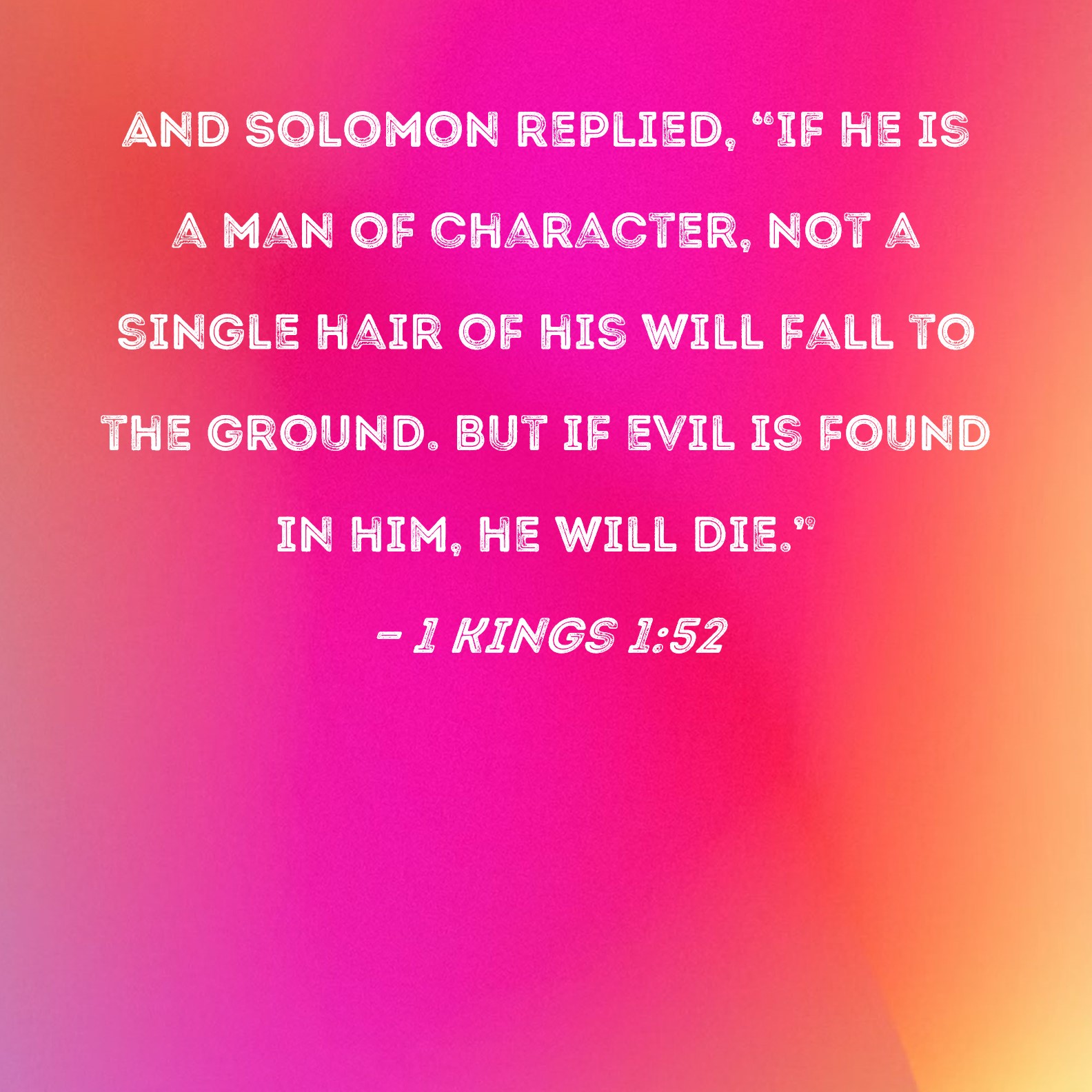 1 Kings 1:52 And Solomon replied, "If he is a man of character, not a single hair of his will fall to the ground. But if evil is found in him, he will die."