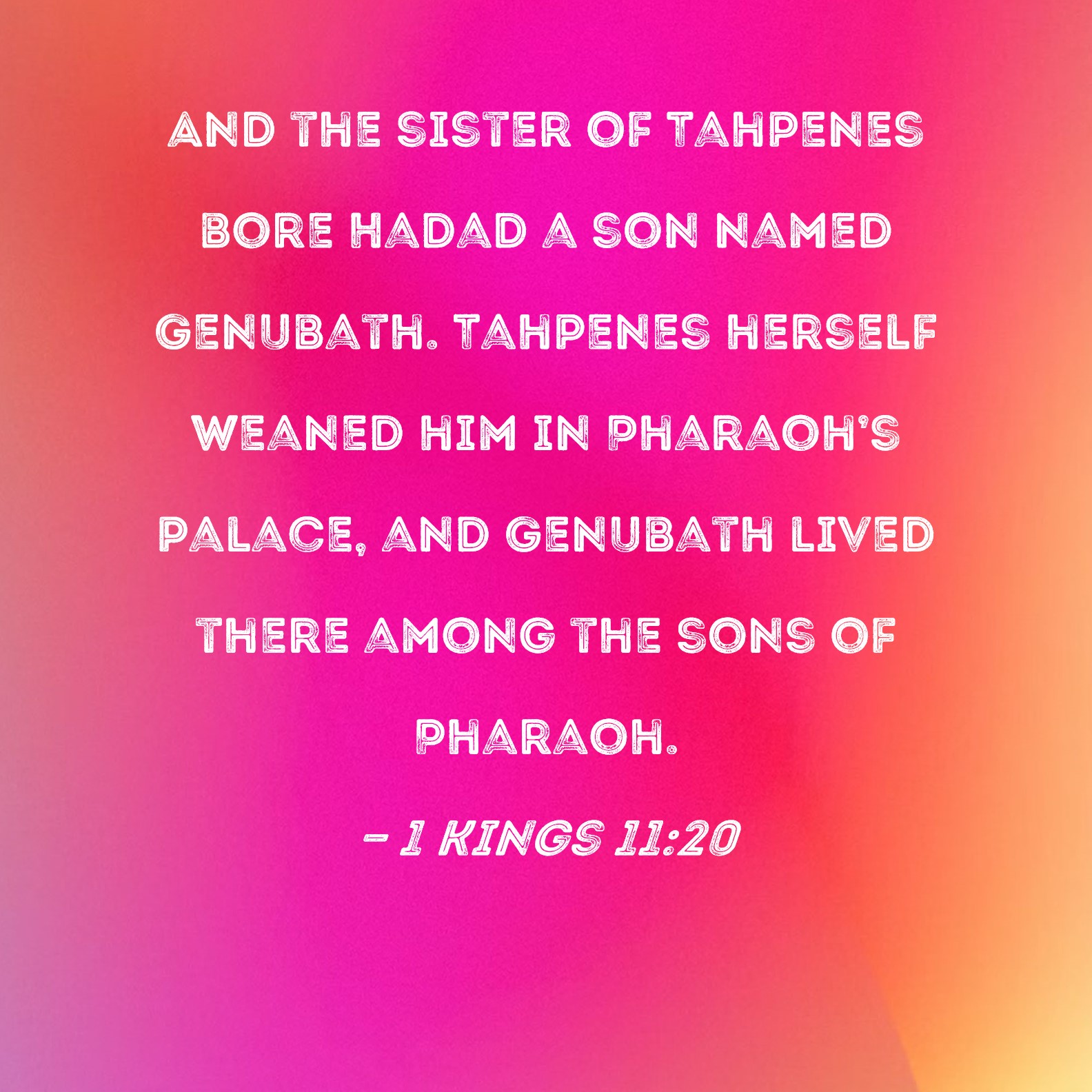 1 Kings 11:20 And the sister of Tahpenes bore Hadad a son named Genubath. Tahpenes herself weaned him in Pharaoh's palace, and Genubath lived there among the sons of Pharaoh.