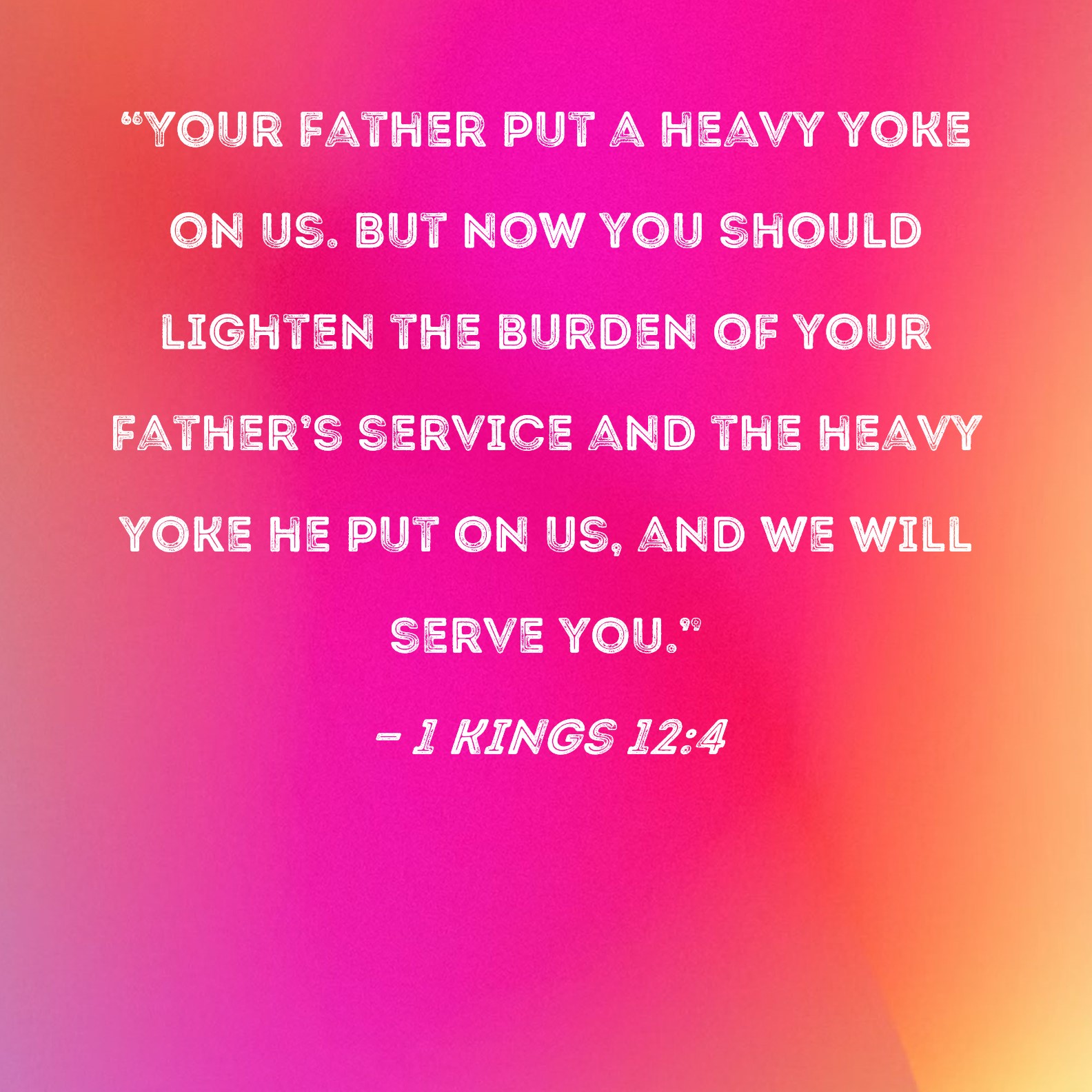 1 Kings 12:4 "Your father put a heavy yoke on us. But now you should lighten the burden of your father's service and the heavy yoke he put on us, and we will serve you."