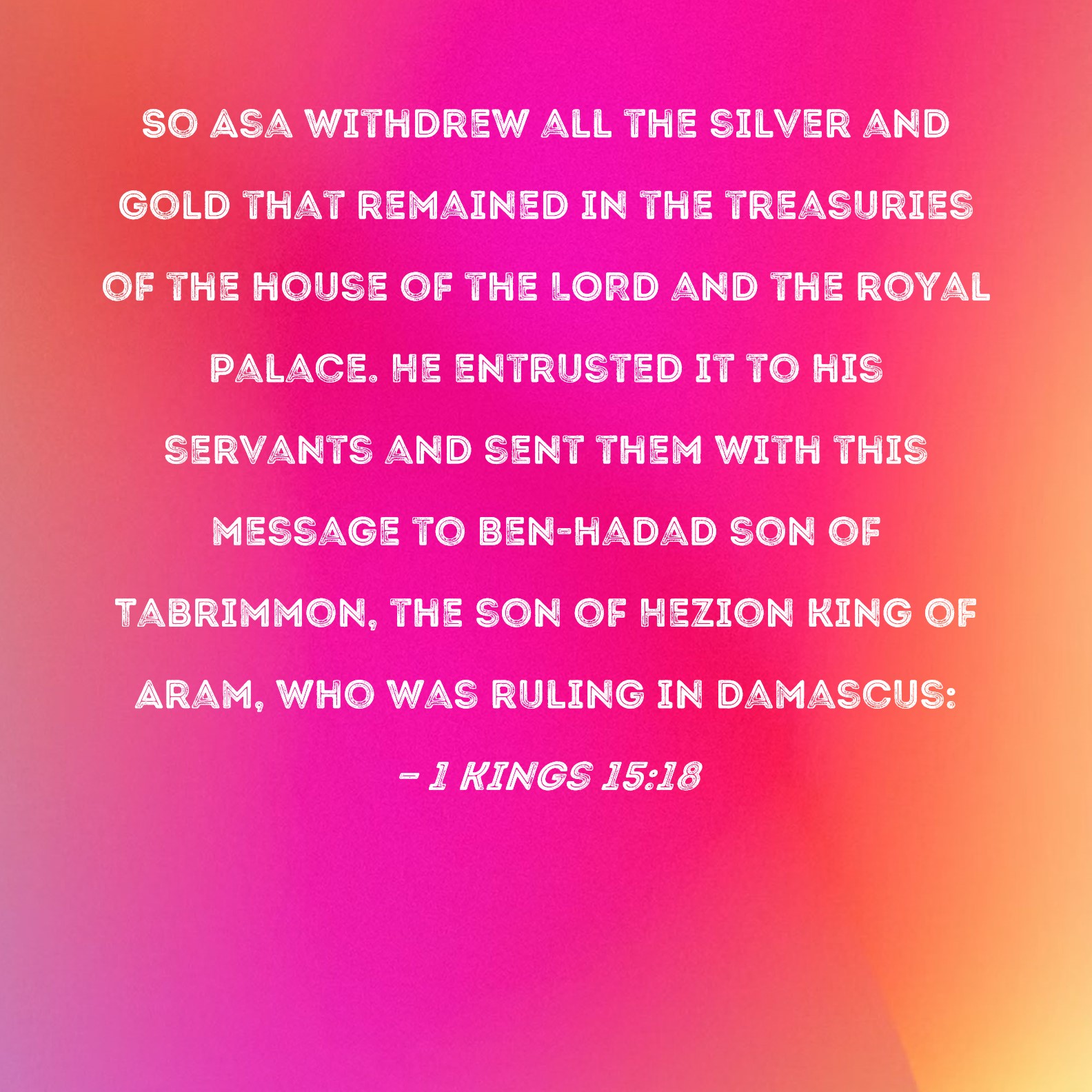 1 Kings 15:18 So Asa withdrew all the silver and gold that remained in the treasuries of the house of the LORD and the royal palace. He entrusted it to his servants and sent them with this message to Ben-hadad son of Tabrimmon, the son of Hezion king of Aram, who was ruling in Damascus:
