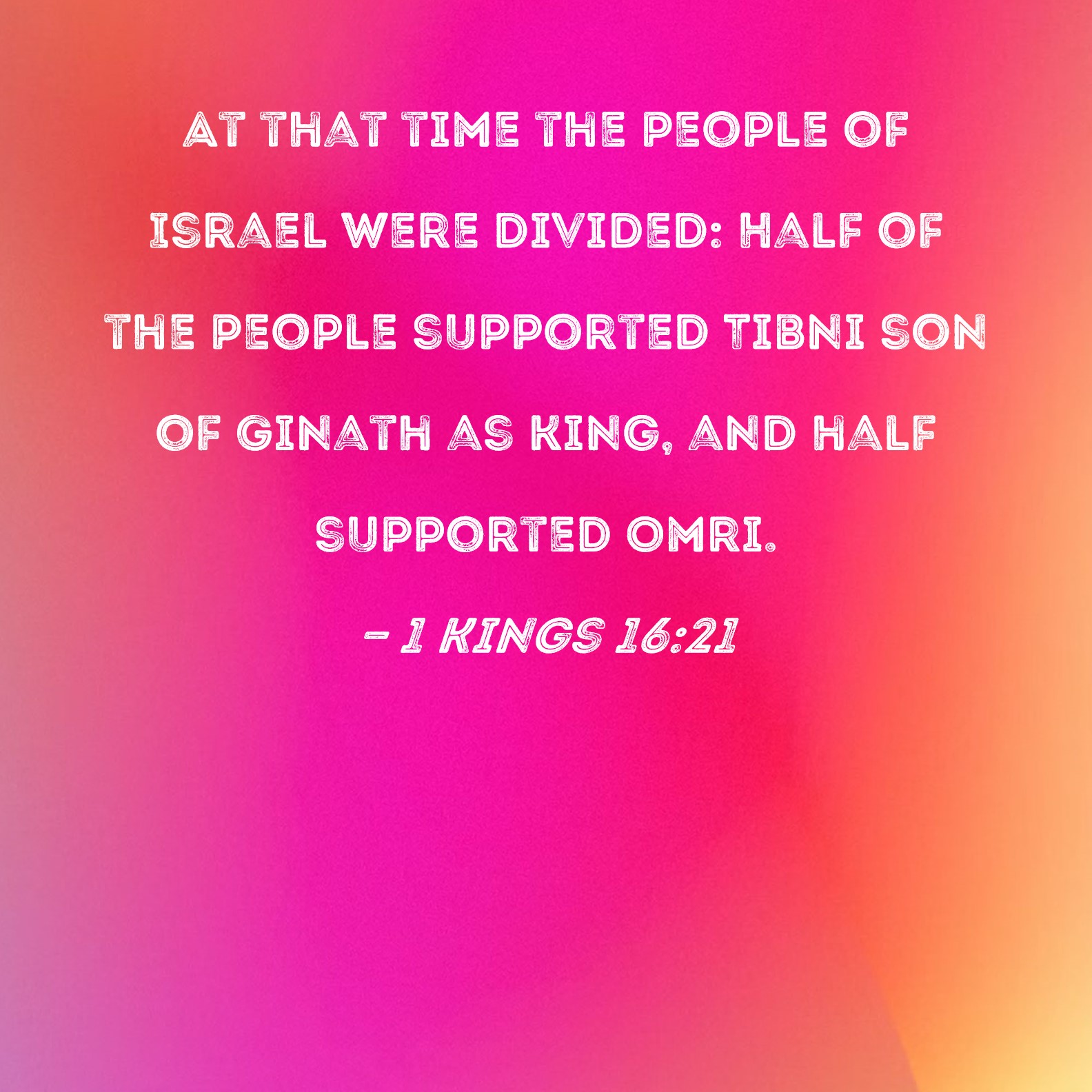 1 Kings 16:21 At that time the people of Israel were divided: Half of the people supported Tibni son of Ginath as king, and half supported Omri.