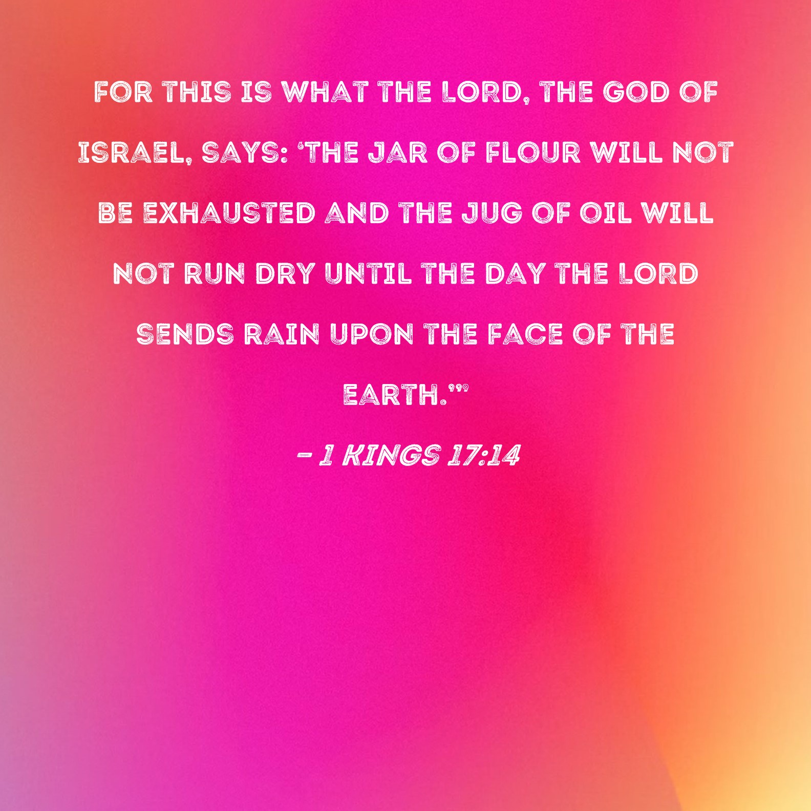 1 Kings 17:14 for this is what the LORD, the God of Israel, says: 'The jar of flour will not be exhausted and the jug of oil will not run dry until the day the LORD sends rain upon the face of the earth.'"