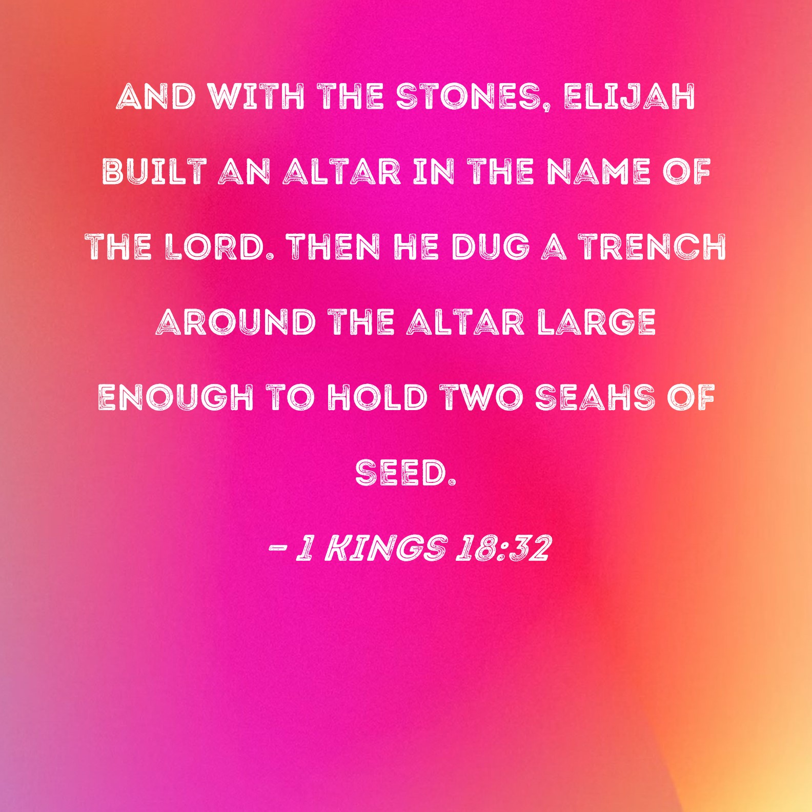 1 Kings 18:32 And with the stones, Elijah built an altar in the name of the LORD. Then he dug a trench around the altar large enough to hold two seahs of seed.