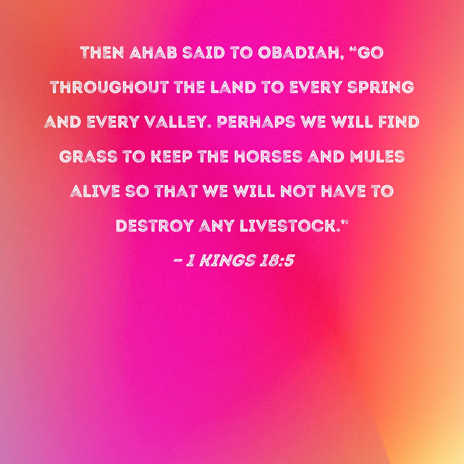 1 Kings 18:5 Then Ahab said to Obadiah, "Go throughout the land to every spring and every valley. Perhaps we will find grass to keep the horses and mules alive so that we will not have to destroy any livestock."