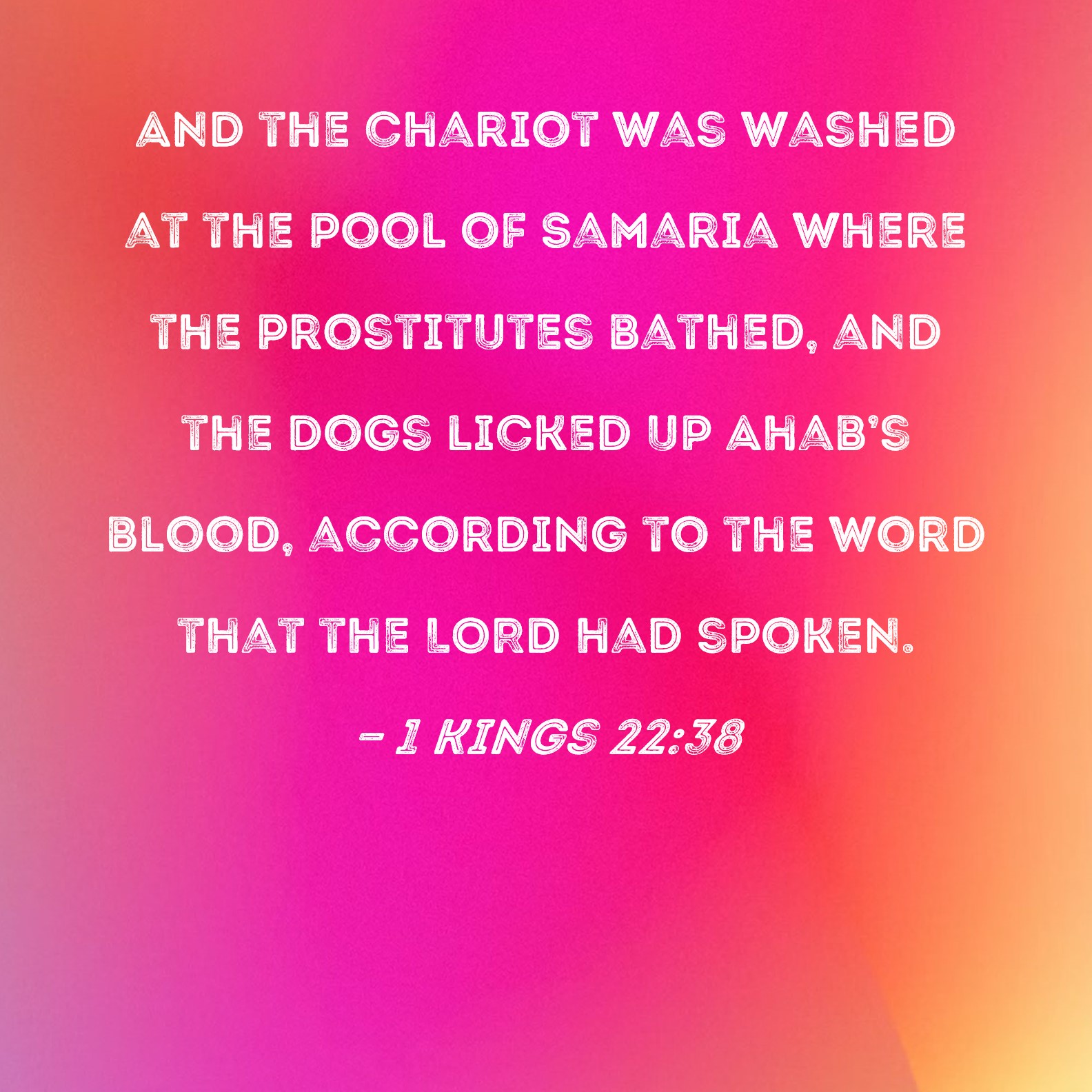 1 Kings 22:38 And the chariot was washed at the pool of Samaria where the prostitutes bathed, and the dogs licked up Ahab's blood, according to the word that the LORD had spoken.