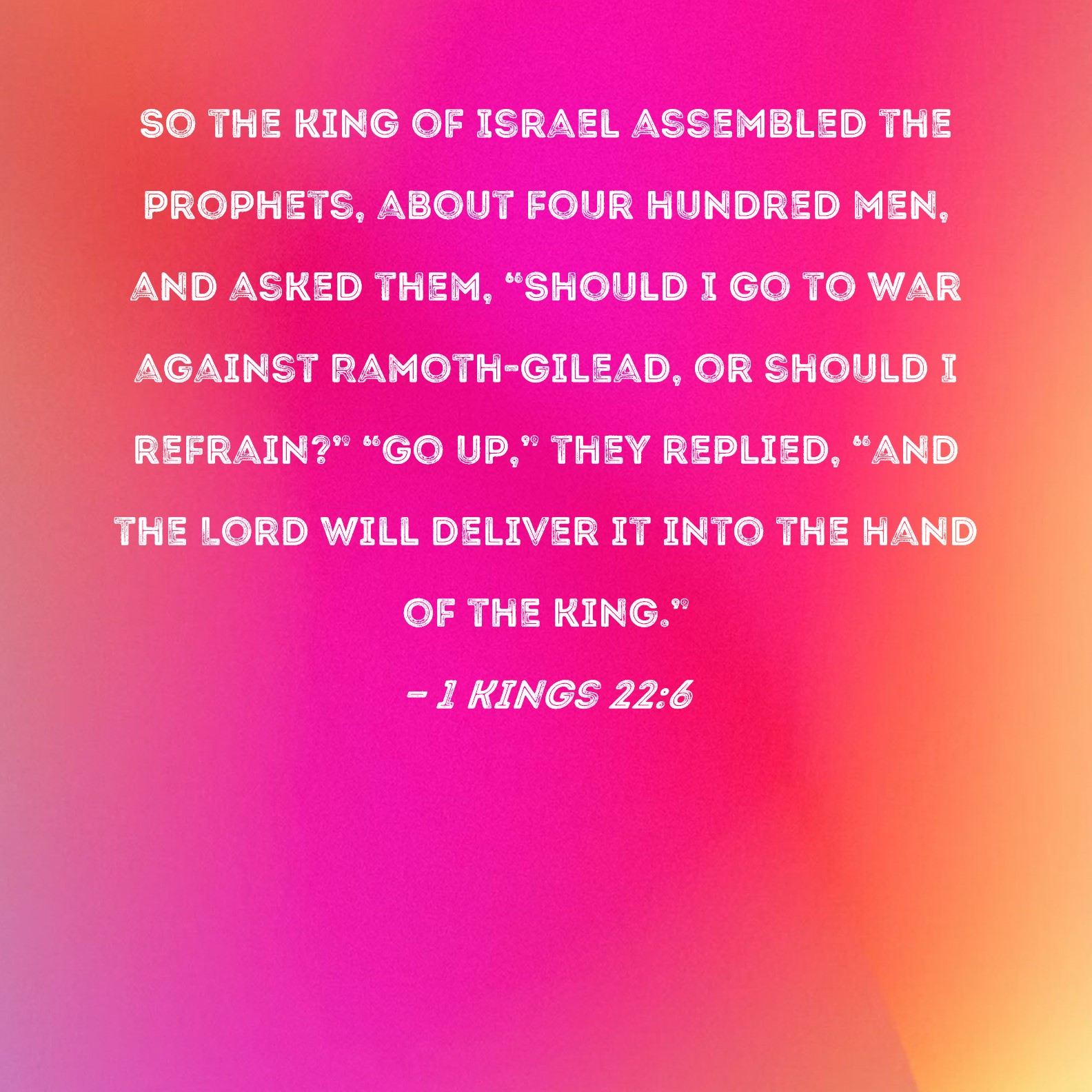 1 Kings 22:6 So the king of Israel assembled the prophets, about four hundred men, and asked them, "Should I go to war against Ramoth-gilead, or should I refrain?" "Go up," they replied, "and the Lord will deliver it into the hand of the king."