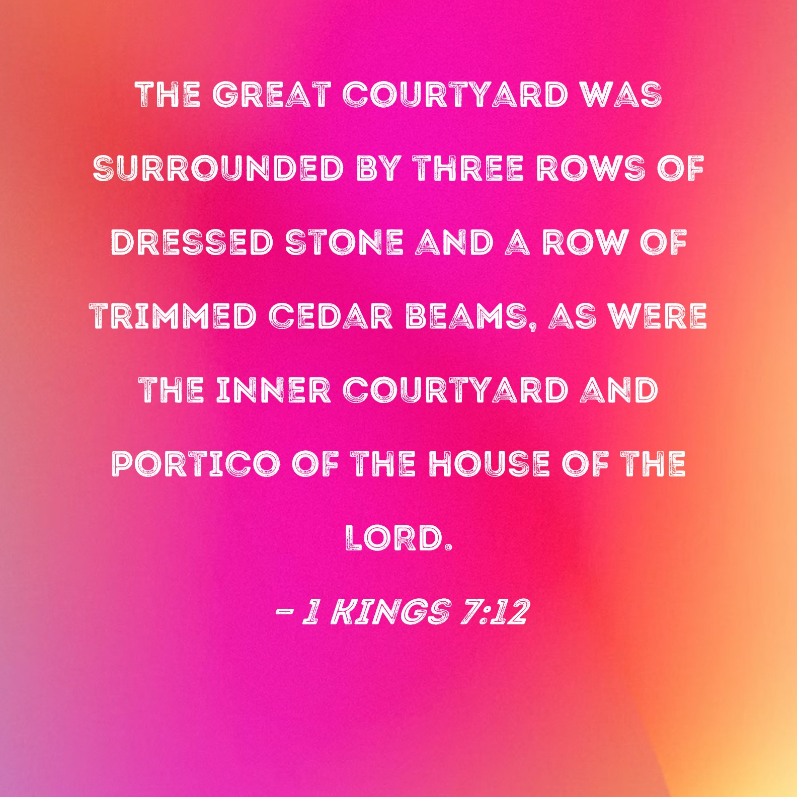 1 Kings 7:12 The great courtyard was surrounded by three rows of dressed stone and a row of trimmed cedar beams, as were the inner courtyard and portico of the house of the LORD.