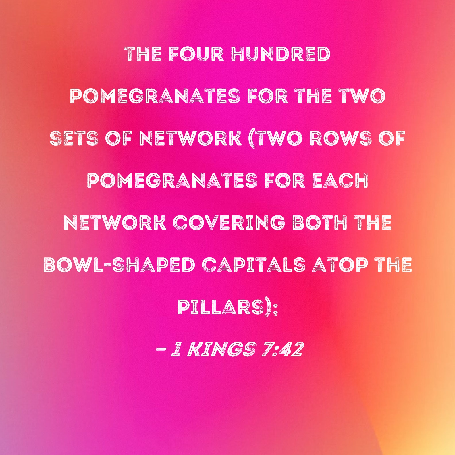 BSB: the four hundred pomegranates for the two sets of network (two rows of pomegranates for each network covering both the bowl-shaped capitals atop the pillars); KJV: And four hundred pomegranates for the two networks, even two rows of pomegranates for one network, to cover the two bowls of the chapiters that were upon the pillars; DRB: And four hundred pomegranates for the two networks: two rows of pomegranates for each network, to cover the cords of the chapiters, which were upon the tops of the pillars. DBT: and the four hundred pomegranates for the two networks, two rows of pomegranates for one network, to cover the two globes of the capitals which were upon the pillars; ERV: and the four hundred pomegranates for the two networks; two rows of pomegranates for each network, to cover the two bowls of the chapiters that were upon the pillars; WBT: And four hundred pomegranates for the two net-works, even two rows of pomegranates for one net-work, to cover the two bowls of the capitals that were upon the pillars; WEB: the four hundred pomegranates for the two networks; two rows of pomegranates for each network, to cover the two bowls of the capitals that were on the pillars; YLT: and the pomegranates four hundred for the two nets, two rows of pomegranates for the one net, to cover the two bowls of the chapiters that are on the front of the pillars;Links 1 Kings 7:42 NIV • 1 Kings 7:42 NLT • 1 Kings 7:42 ESV • 1 Kings 7:42 NASB • 1 Kings 7:42 KJV • 1 Kings 7:42 Interlinear • 1 Kings 7:42 Commentaries • 1 Kings 7:42 Parallel Texts • 1 Kings 7:42 Bible Apps • 1 Kings 7:42 Parallel • Bible Hub |
