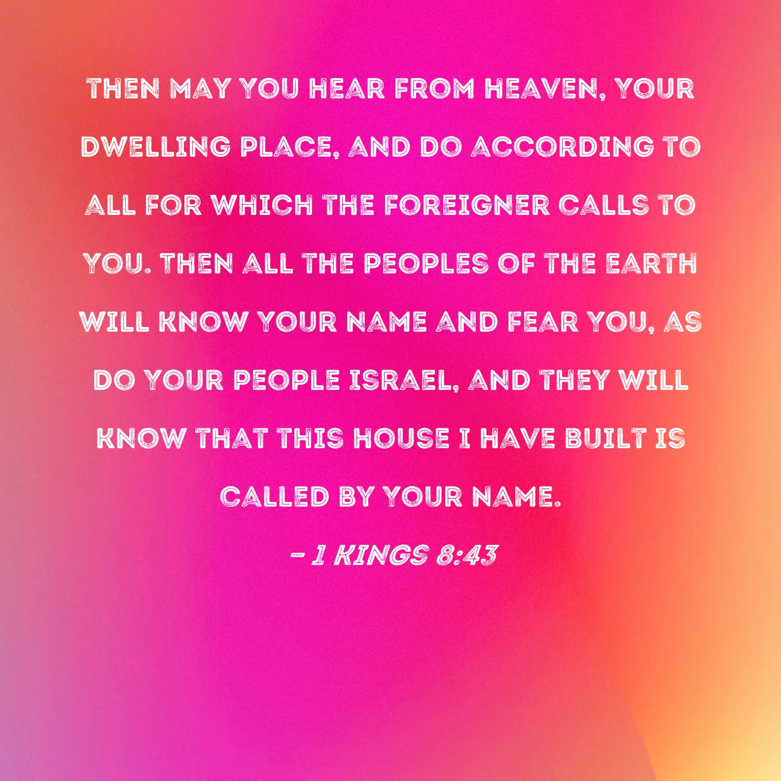 1 Kings 8:43 then may You hear from heaven, Your dwelling place, and do according to all for which the foreigner calls to You. Then all the peoples of the earth will know Your name and fear You, as do Your people Israel, and they will know that this house I have built is called by Your Name.