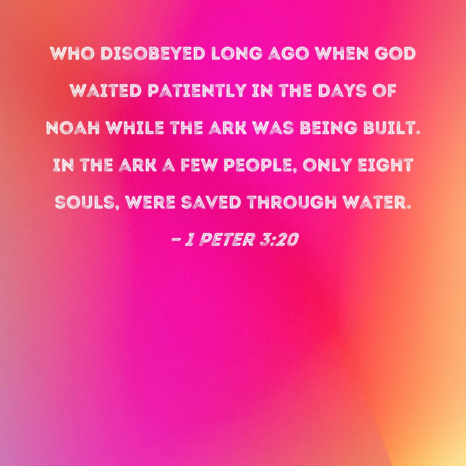 1 Peter 3:20 who disobeyed long ago when God waited patiently in the days of Noah while the ark was being built. In the ark a few people, only eight souls, were saved through water.