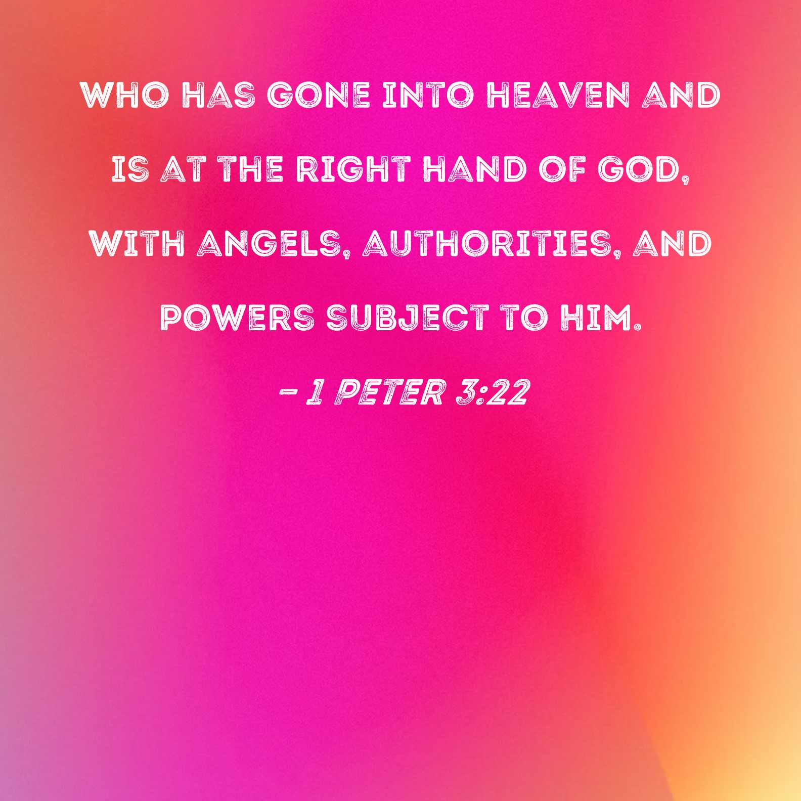 BSB: who has gone into heaven and is at the right hand of God, with angels, authorities, and powers subject to Him. KJV: Who is gone into heaven, and is on the right hand of God; angels and authorities and powers being made subject unto him. DRB: Who is on the right hand of God, swallowing down death, that we might be made heirs of life everlasting: being gone into heaven, the angels and powers and virtues being made subject to him. DBT: who is at the right hand of God, gone into heaven, angels and authorities and powers being subjected to him. ERV: who is on the right hand of God, having gone into heaven; angels and authorities and powers being made subject unto him. WBT: Who is gone into heaven, and is on the right hand of God; angels, and authorities, and powers being made subject to him. WEB: who is at the right hand of God, having gone into heaven, angels and authorities and powers being made subject to him. YLT: who is at the right hand of God, having gone on to heaven — messengers, and authorities, and powers, having been subjected to him.Links 1 Peter 3:22 NIV • 1 Peter 3:22 NLT • 1 Peter 3:22 ESV • 1 Peter 3:22 NASB • 1 Peter 3:22 KJV • 1 Peter 3:22 Interlinear • 1 Peter 3:22 Commentaries • 1 Peter 3:22 Parallel Texts • 1 Peter 3:22 Bible Apps • 1 Peter 3:22 Parallel • Bible Hub |