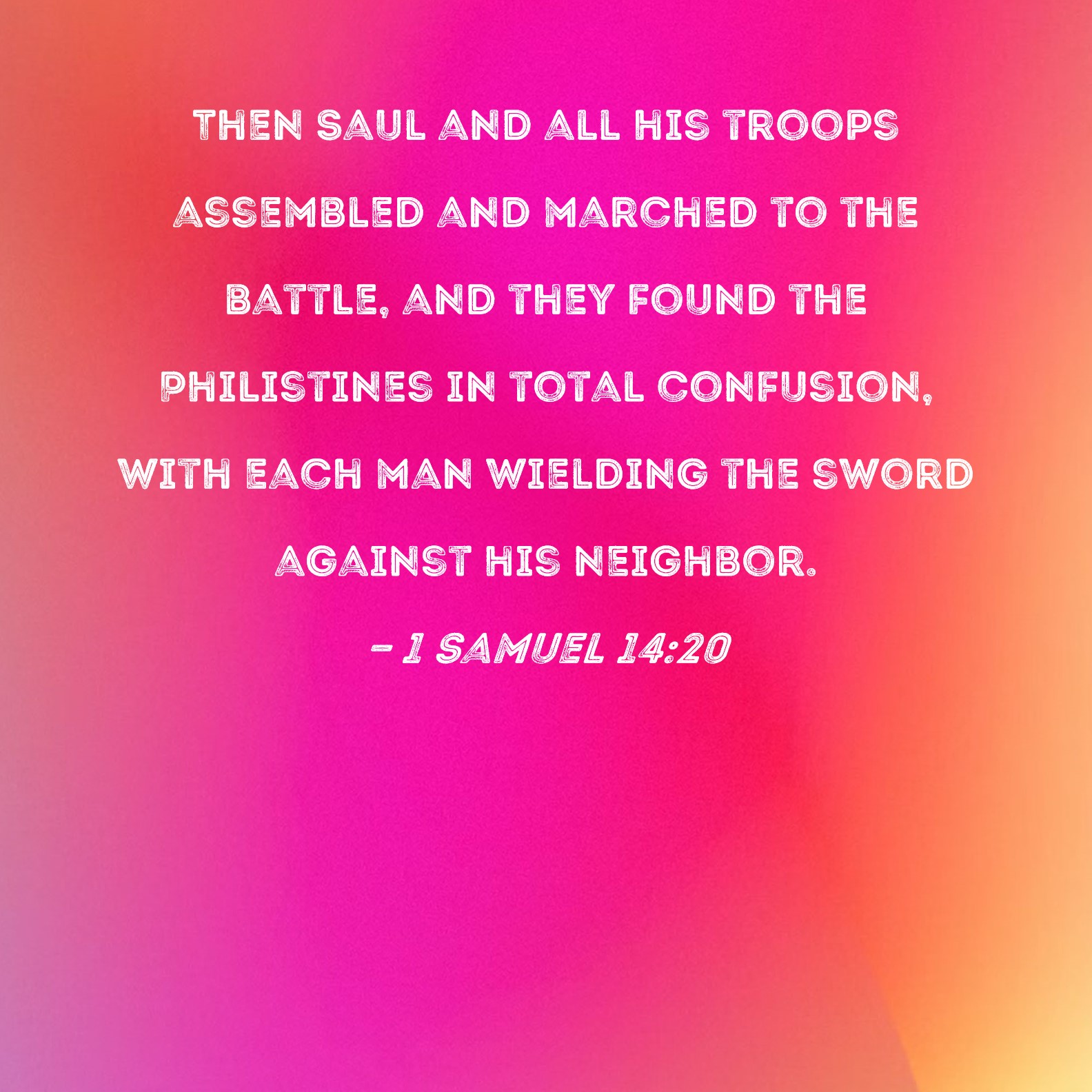 1 Samuel 14:20 Then Saul and all his troops assembled and marched to the battle, and they found the Philistines in total confusion, with each man wielding the sword against his neighbor.