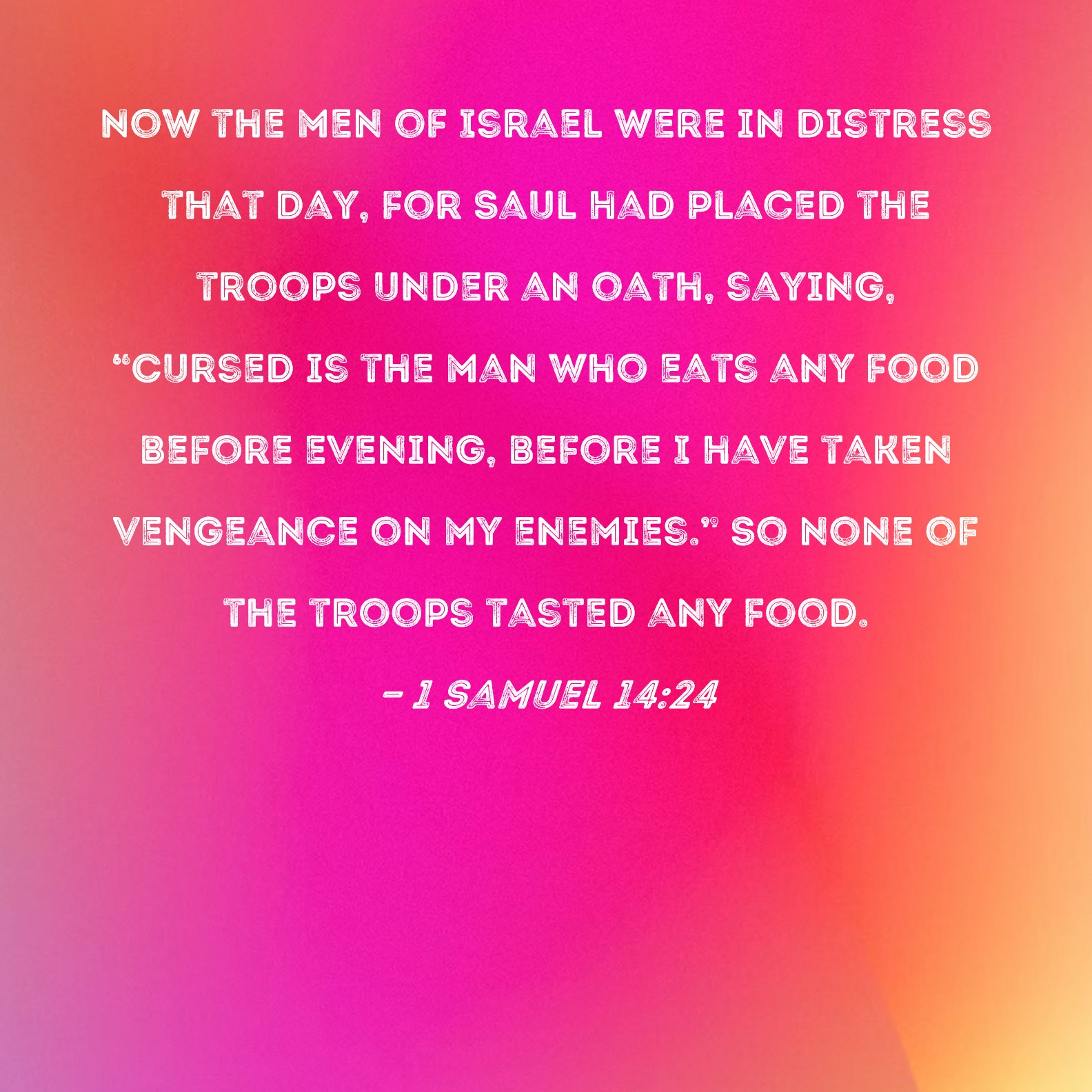 1 Samuel 14:24 Now the men of Israel were in distress that day, for Saul had placed the troops under an oath, saying, "Cursed is the man who eats any food before evening, before I have taken vengeance on my enemies." So none of the troops tasted any food.