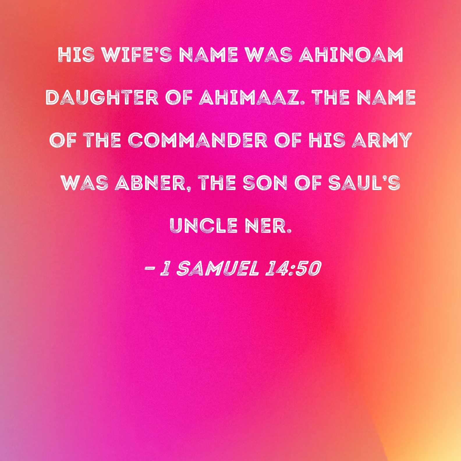 KJV:  And the name of Saul's wife was Ahinoam, the daughter of Ahimaaz: and the name of the captain of his host was Abner, the son of Ner, Saul's uncle.