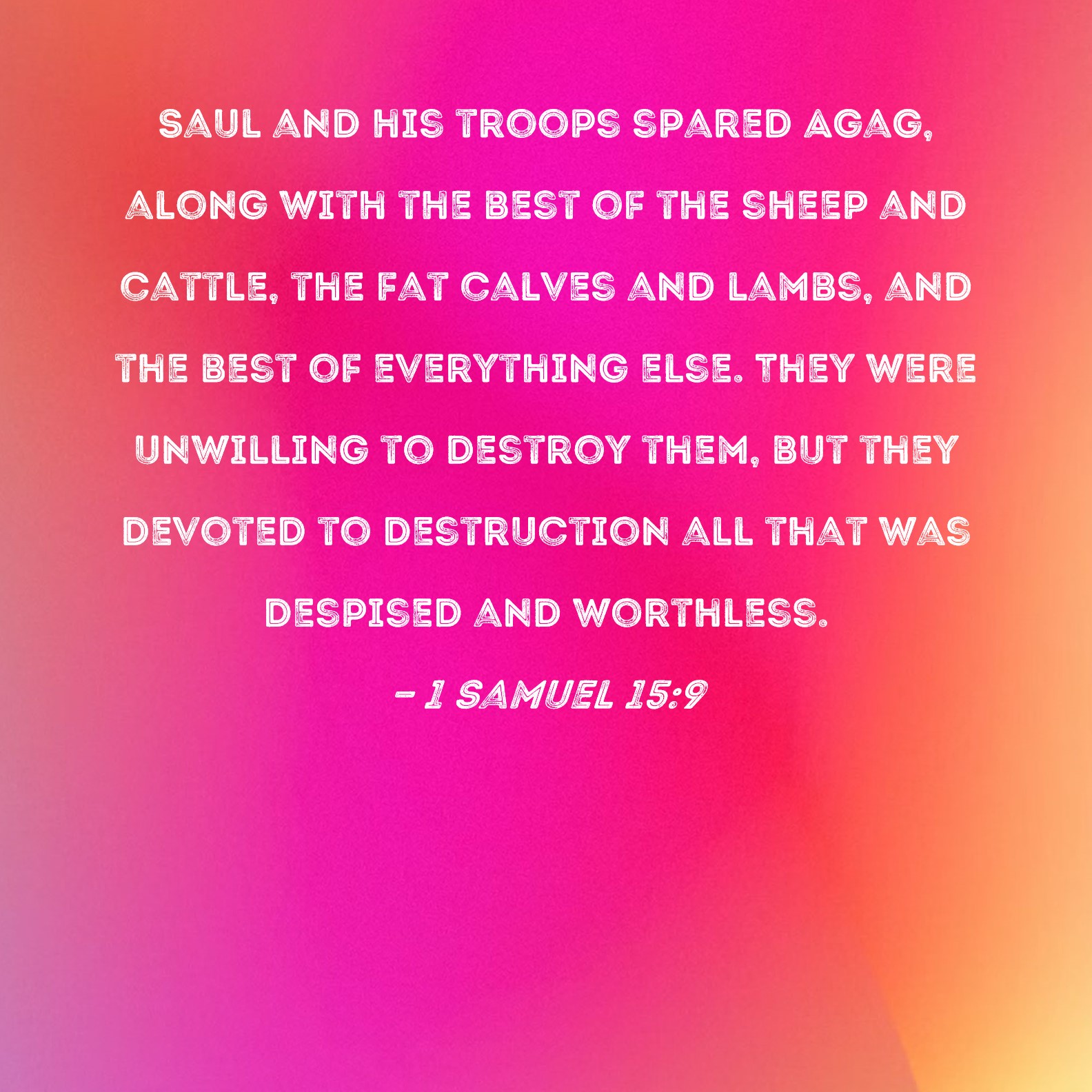 1 Samuel 15:9 Saul and his troops spared Agag, along with the best of the sheep and cattle, the fat calves and lambs, and the best of everything else. They were unwilling to destroy them, but they devoted to destruction all that was despised and worthless.