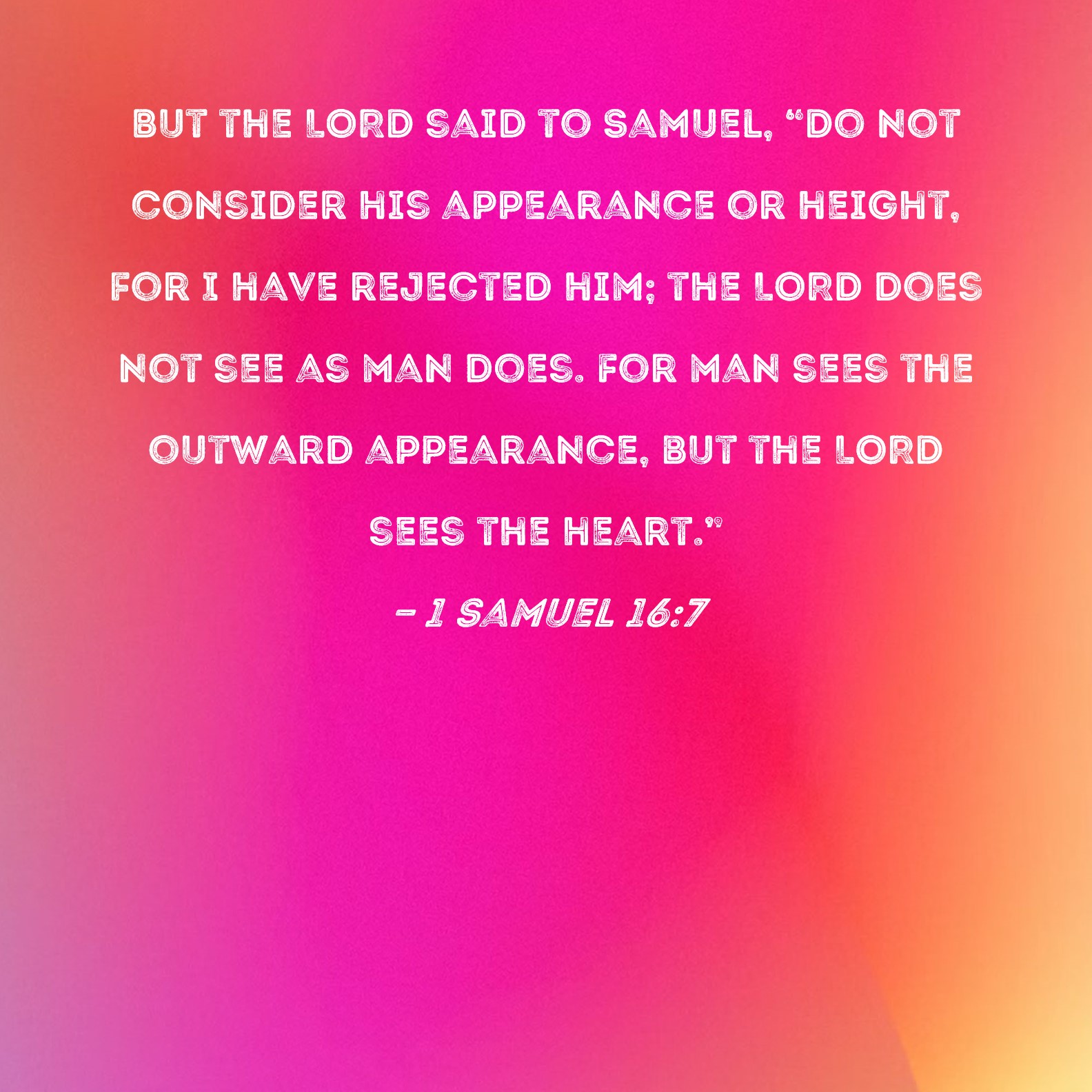 1 Samuel 16:7 But the LORD said to Samuel, "Do not consider his appearance or height, for I have rejected him; the LORD does not see as man does. For man sees the outward appearance, but the LORD sees the heart."